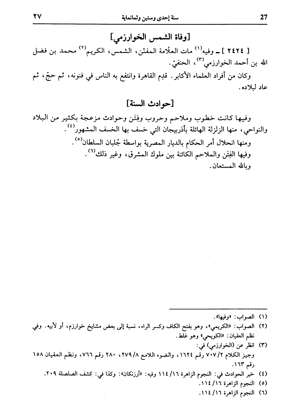 (¬3) انظر عن (الخوارزمي) في: وجيز الكلام 2/ 707 رقم 1624، والضوء اللامع 8/ 279، 280 رقم 766، ونظم العقيان 158 رقم 163.