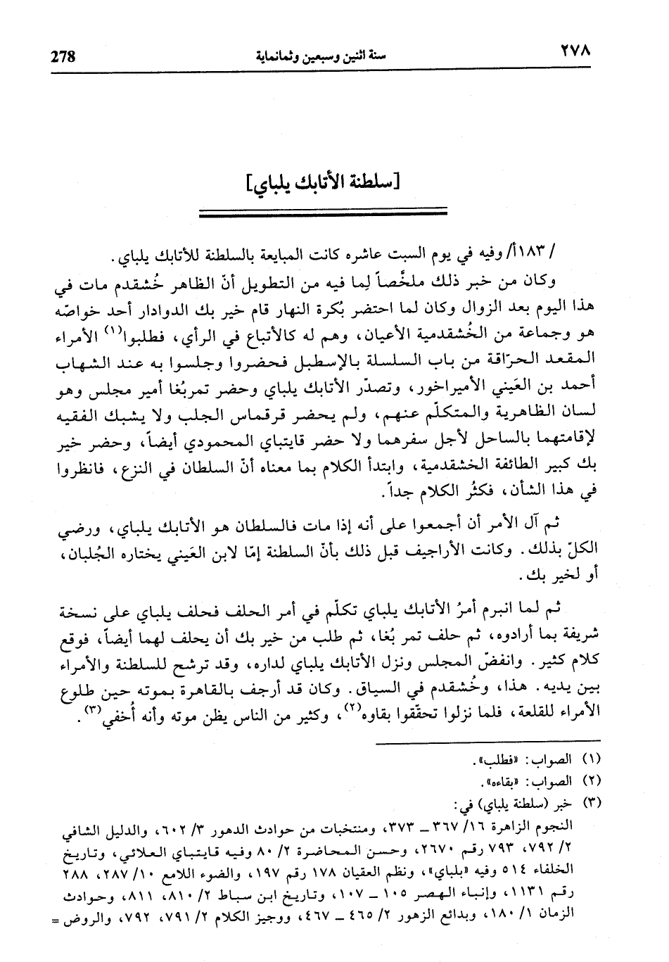 / 183 أ / وفيه في يوم السبت عاشره كانت المبايعة بالسلطنة للأتابك يلباي.