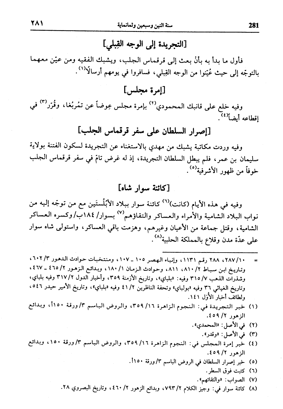 (¬8) كائنة سوار في: وجيز الكلام 2/ 793، وبدائع الزهور 2/ 460، وتاريخ البصروي 28.