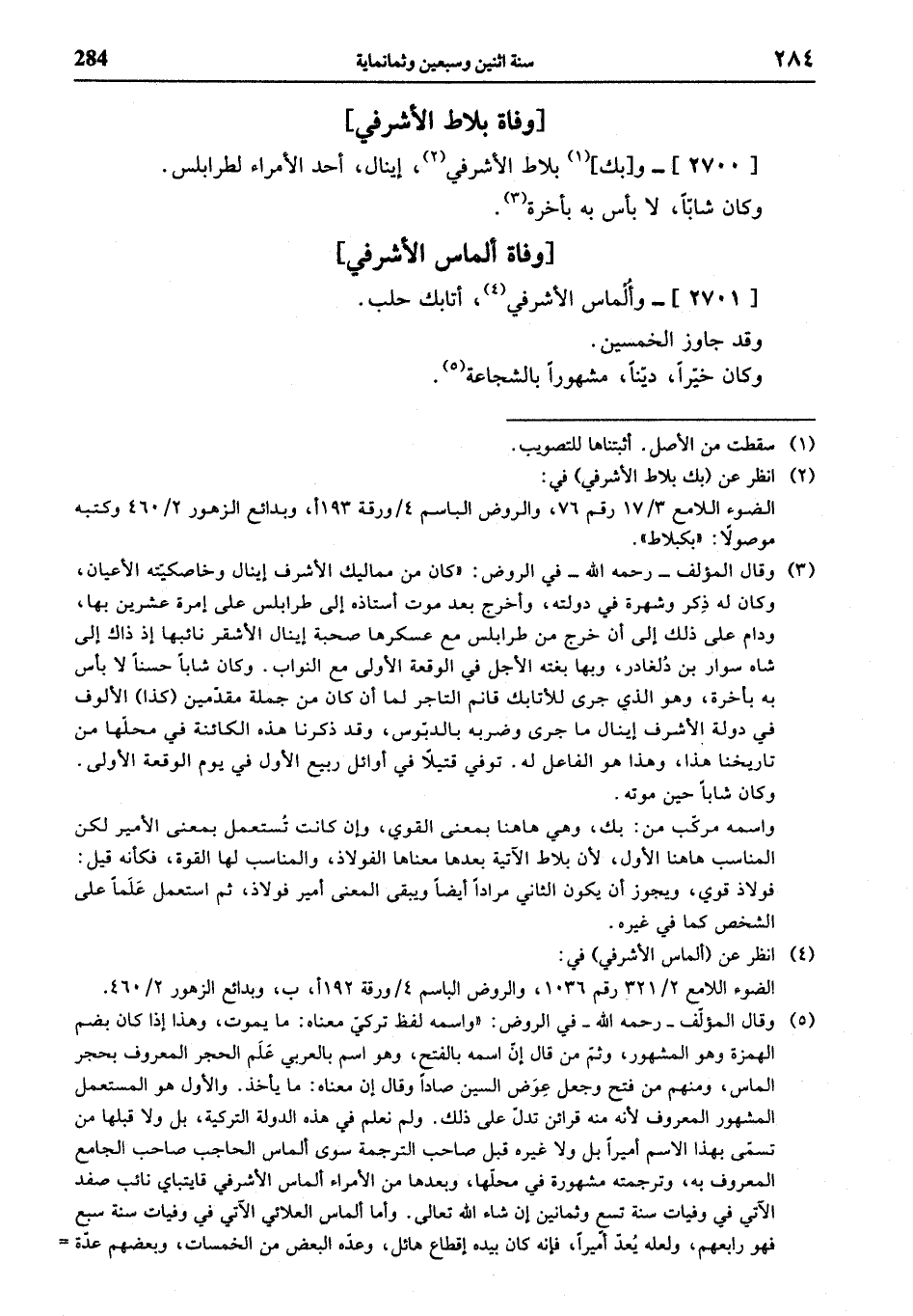 (¬2) انظر عن (بك بلاط الأشرفي) في: الضوء اللامع 3/ 17 رقم 76، والروض الباسم 4 / ورقة 193 أ، وبدائع الزهور 2/ 460 وكتبه موصولا: «بكبلاط».