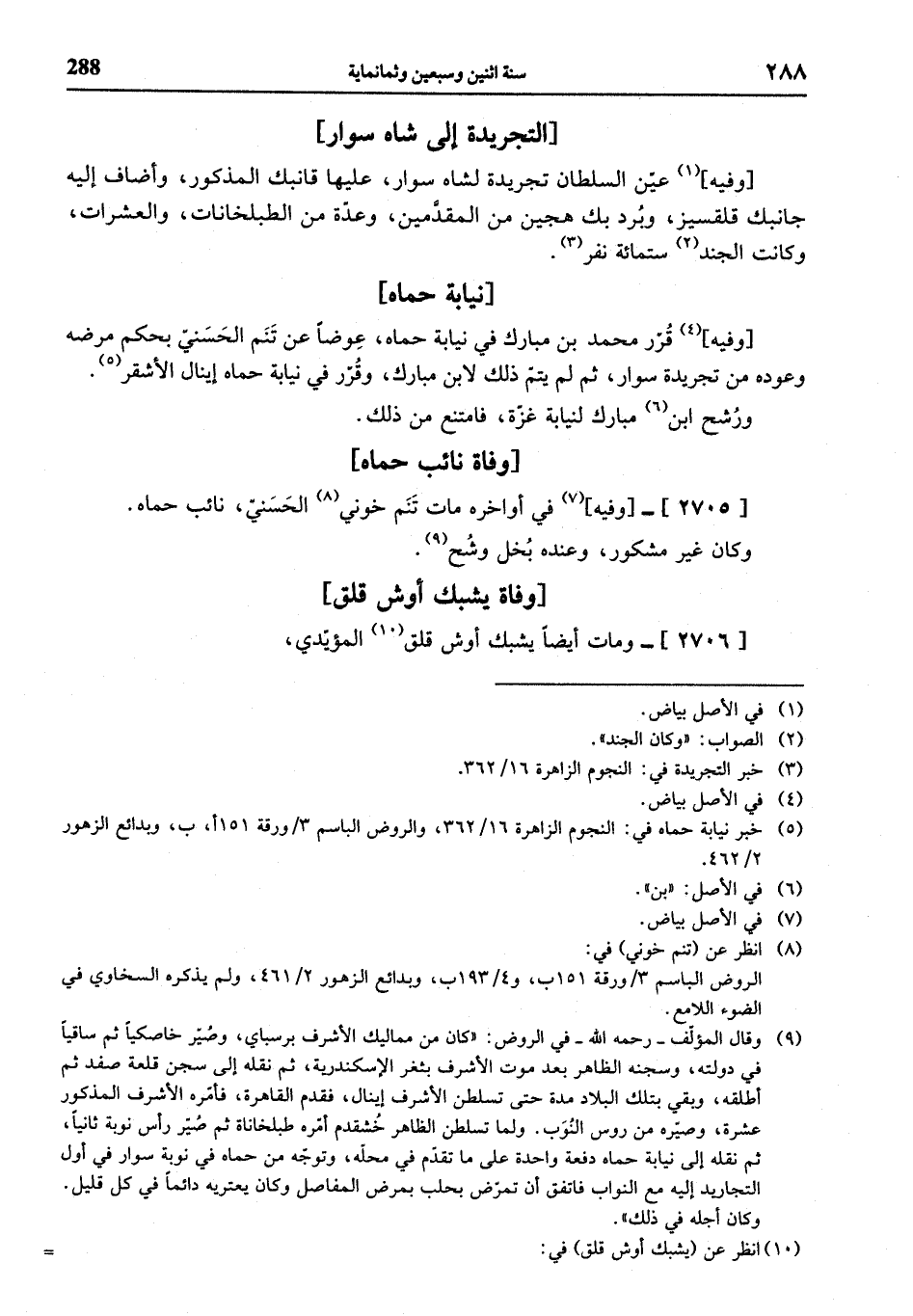 (¬5) خبر نيابة حماه في: النجوم الزاهرة 16/ 362، والروض الباسم 3 / ورقة 151 أ، ب، وبدائع الزهور 2/ 462.