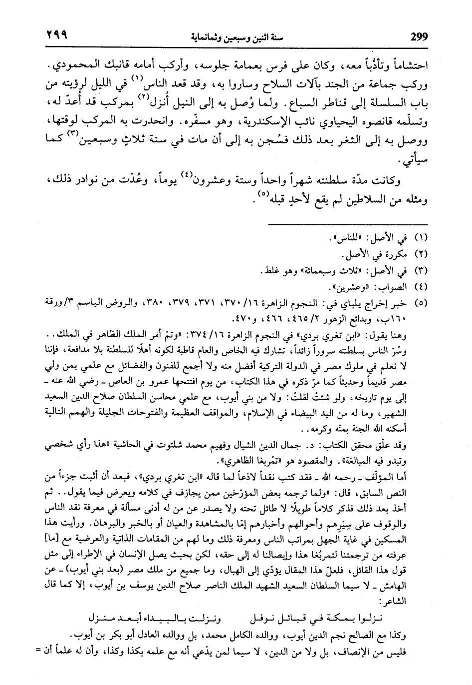(¬5) خبر إخراج يلباي في: النجوم الزاهرة 16/ 370، 371، 379، 380، والروض الباسم 3 / ورقة 160 ب، وبدائع الزهور 2/ 465، 466، و 470. وهنا يقول: «ابن تغري بردي» في النجوم الزاهرة 16/ 374: «وتمّ أمر الملك الظاهر في الملك. . وسرّ الناس بسلطنته سرورا زائدا، تشارك فيه الخاص والعام قاطبة لكونه أهلا للسلطنة بلا مدافعة، فإننا لا نعلم في ملوك مصر في الدولة التركية أفضل منه ولا أجمع للفنون والفضائل مع علمي بمن ولي مصر قديما وحديثا كما مرّ ذكره في هذا الكتاب، من يوم افتتحها عمرو بن العاص - رضي الله عنه - إلى يوم تاريخه، ولو شئت لقلت: ولا من بني أيوب، مع علمي محاسن السلطان صلاح الدين السعيد الشهير، وما له من اليد البيضاء في الإسلام، والمواقف العظيمة والفتوحات الجليلة والهمم التالية أسكنه الله الجنة بمنّه وكرمه. . وقد علّق محقق الكتاب: د. جمال الدين الشيال وفهيم محمد شلتوت في الحاشية «هذا رأي شخصي وتبدو فيه المبالغة». والمقصود هو «تمربغا الظاهري». أما المؤلّف - رحمه الله - فقد كتب نقدا لاذعا لما قاله «ابن تغري بردي»، فبعد أن أثبت جزءا من النص السابق، قال: «ولما ترجمه بعض المؤرّخين ممن يجازف في كلامه ويعرض فيما يقول. . . ثم أخذ بعد ذلك فذكر كلاما طويلا لا طائل تحته ولا يصدر عن من له أدنى مسألة في معرفة نقد الناس والوقوف على سيرهم وأحوالهم وأخبارهم إمّا بالمشاهدة والعيان أو بالخبر والبرهان. ورأيت هذا المسكين في غاية الجهل بمراتب الناس ومعرفة ذلك وما لهم من المقامات الذاتية والعرضية مع [ما] عرفته من ترجمتنا لتمربغا هذا وإيصالنا له إلى حقه، لكن بحيث يصل الإنسان في الإطراء إلى مثل قول هذا القائل، فلعلّ هذا المقال يؤدّي إلى الهبال، وما جميع من ملك مصر (بعد بني أيوب) - عن الهامش - لا سيما السلطان السعيد الشهيد الملك الناصر صلاح الدين يوسف بن أيوب، إلا كما قال الشاعر: نزلوا بمكة في قبائل نوفل ونزلت بالبيداء أبعد منزل وكذا مع الصالح نجم الدين أيوب، ووالده الكامل محمد، بل ووالده العادل أبو بكر بن أيوب. فليس من الإنصاف، بل ولا من الدين، لا سيما لمن يدّعي أنه مع علمه بكذا وكذا، وأن له علما أن =