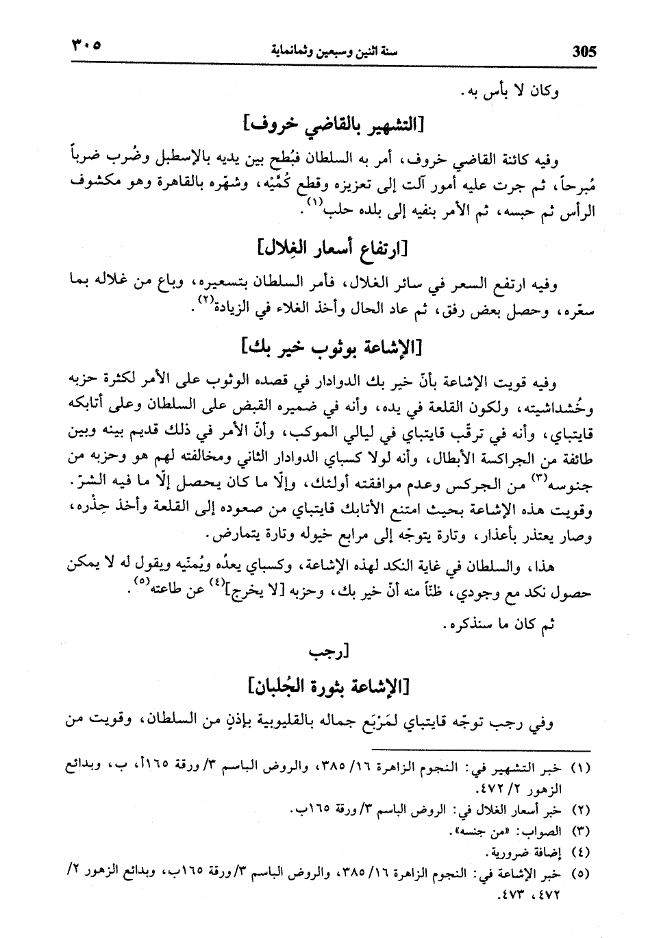 وفيه قويت الإشاعة بأنّ خير بك الدوادار في قصده الوثوب على الأمر لكثرة حزبه وخشداشيته، ولكون القلعة في يده، وأنه في ضميره القبض على السلطان وعلى أتابكه قايتباي، وأنه في ترقّب قايتباي في ليالي الموكب، وأنّ الأمر في ذلك قديم بينه وبين طائفة من الجراكسة الأبطال، وأنه لولا كسباي الدوادار الثاني ومخالفته لهم هو وحزبه من جنوسه (¬3) من الجركس وعدم موافقته أولئك، وإلاّ ما كان يحصل إلاّ ما فيه الشرّ. وقويت هذه الإشاعة بحيث امتنع الأتابك قايتباي من صعوده إلى القلعة وأخذ حذره، وصار يعتذر بأعذار، وتارة يتوجّه إلى مرابع خيوله وتارة يتمارض.