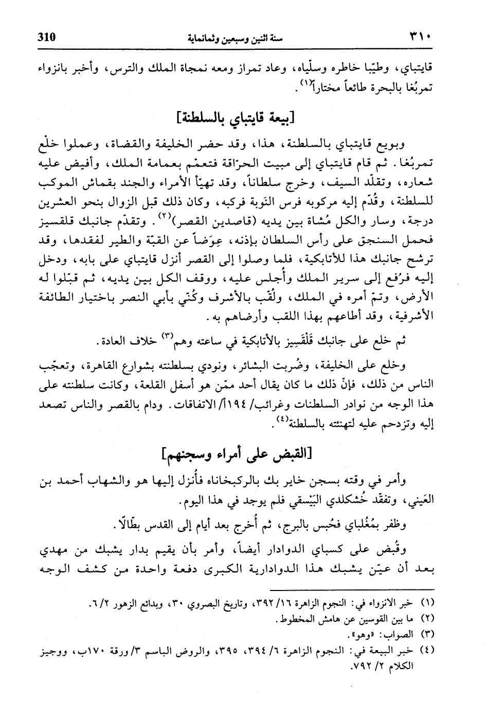 (¬4) خبر البيعة في: النجوم الزاهرة 6/ 394، 395، والروض الباسم 3 / ورقة 170 ب، ووجيز الكلام 2/ 792.