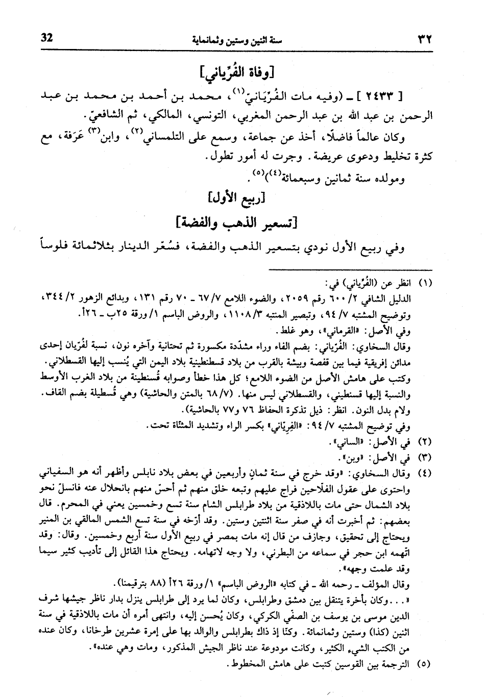 (¬1) انظر عن (الفرّياني) في: الدليل الشافي 2/ 600 رقم 2059، والضوء اللامع 7/ 67 - 70 رقم 131، وبدائع الزهور 2/ 344، وتوضيح المشتبه 7/ 94، وتبصير المنتبه 3/ 1108، والروض الباسم 1 / ورقة 25 ب - 26 أ. وفي الأصل: «القرماني»، وهو غلط. وقال السخاوي: الفرّياني: بضم الفاء وراء مشدّدة مكسورة ثم تحتانية وآخره نون، نسبة لفرّيان إحدى مدائن إفريقية فيما بين قفصة وبيشة بالقرب من بلاد قسطنطينية بلاد اليمن التي ينسب إليها القسطلاني. وكتب على هامش الأصل من الضوء اللامع؛ كل هذا خطأ وصوابه قسنطينة من بلاد الغرب الأوسط والنسبة إليها قسنطيني، والقسطلاني ليس منها. (7/ 68 بالمتن والحاشية) وهي قسطيلة بضم القاف. ولام بدل النون. انظر: ذيل تذكرة الحفاظ 76 و 77 بالحاشية). وفي توضيح المشتبه 7/ 94: «الفريّاني» بكسر الراء وتشديد المثنّاة تحت.