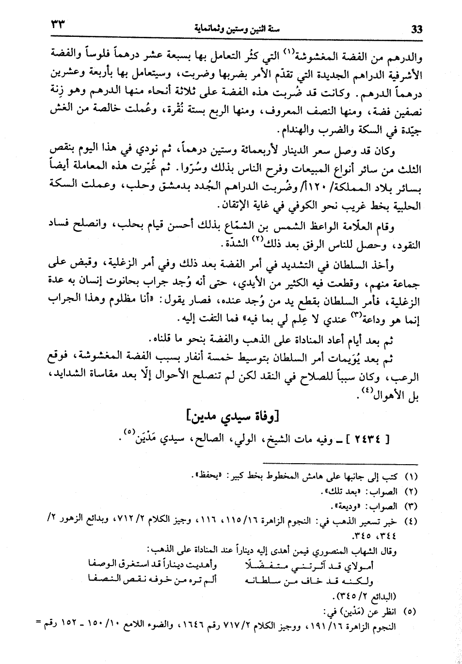 وكان قد وصل سعر الدينار لأربعمائة وستين درهما، ثم نودي في هذا اليوم بنقص الثلث من سائر أنواع المبيعات وفرح الناس بذلك وسرّوا. ثم غيّرت هذه المعاملة أيضا بسائر بلاد المملكة / 120 أ / وضربت الدراهم الجدد بدمشق وحلب، وعملت السكة الحلبية بخط غريب نحو الكوفي في غاية الإتقان.