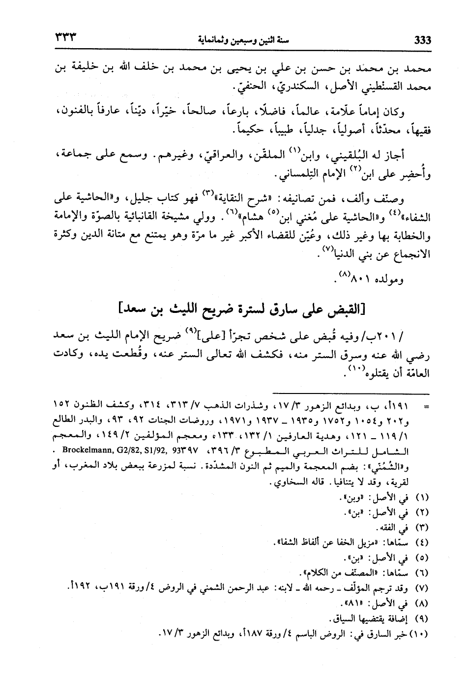 / 201 ب / وفيه قبض على شخص تجرّأ [على] (¬9) ضريح الإمام الليث بن سعد رضي الله عنه وسرق الستر منه، فكشف الله تعالى الستر عنه، وقطعت يده، وكادت العامّة أن يقتلوه (¬10).