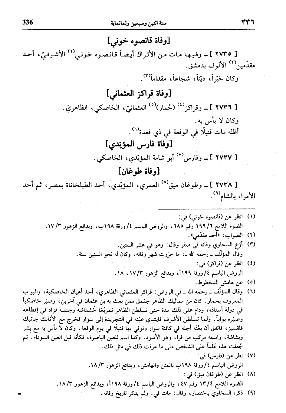 (¬8) انظر عن (طوغان ميق) في: الضوء اللامع 4/ 13 رقم 47، والروض الباسم 4 / ورقة 198 أ، وبدائع الزهور 3/ 18.