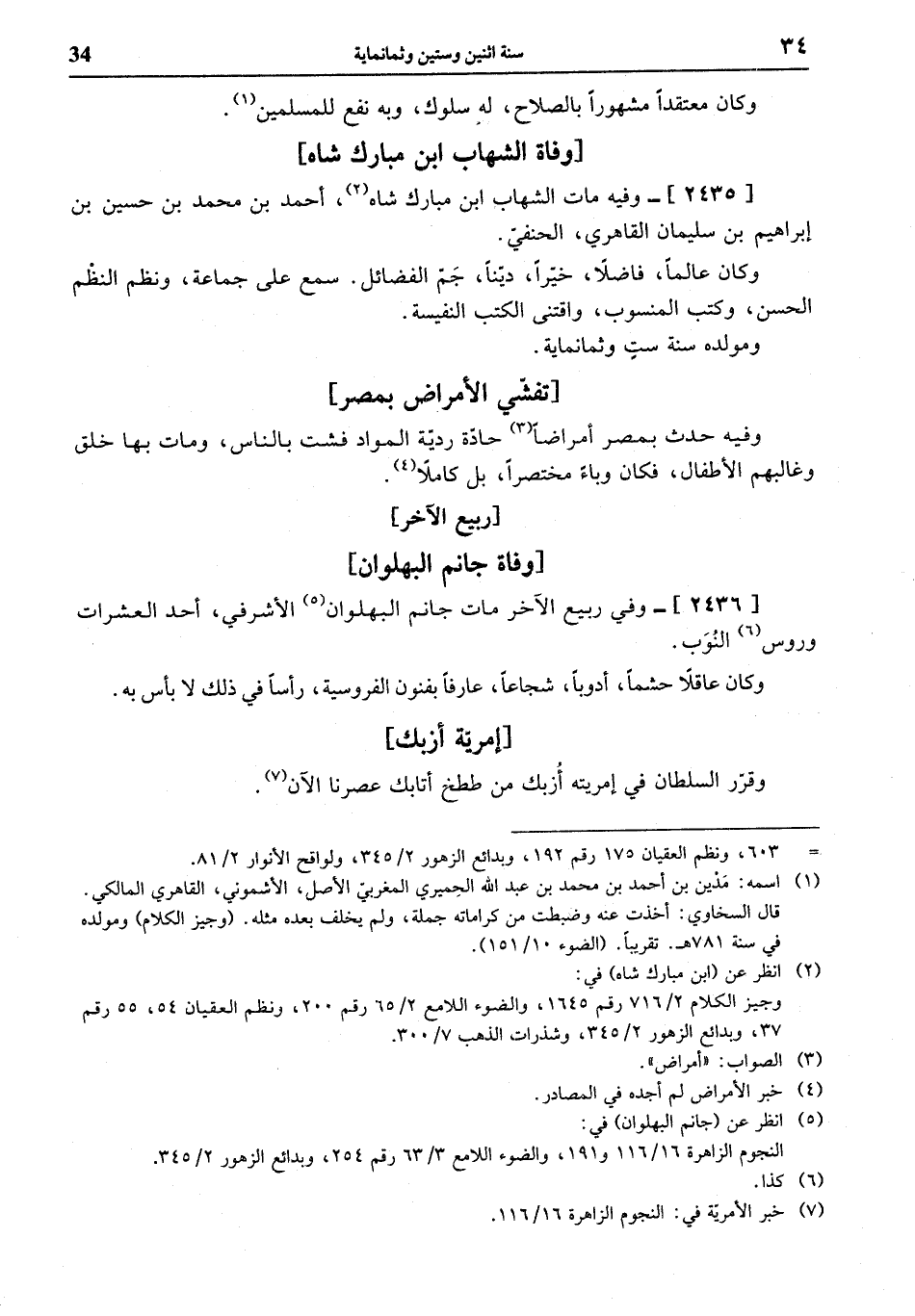 (¬2) انظر عن (ابن مبارك شاه) في: وجيز الكلام 2/ 716 رقم 1645، والضوء اللامع 2/ 65 رقم 200، ونظم العقيان 54، 55 رقم 37، وبدائع الزهور 2/ 345، وشذرات الذهب 7/ 300.