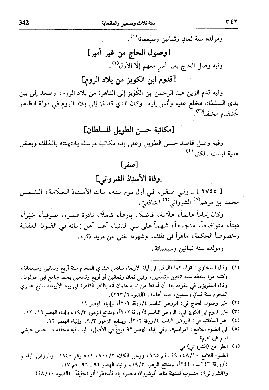 (¬6) انظر عن (الشرواني) في: الضوء اللامع 10/ 48، 49 رقم 165، ووجيز الكلام 2/ 800، 801 رقم 1840، والروض الباسم 4 / ورقة 243 ب، 244 أ، وبدائع الزهور 3/ 19، وإنباء الهصر 92 - 96 رقم 17. و «الشرواني»: منسوب لمدينة بناها أنو شروان محمود باد فأسقطوا أنو تخفيفا. (الضوء 10/ 48).