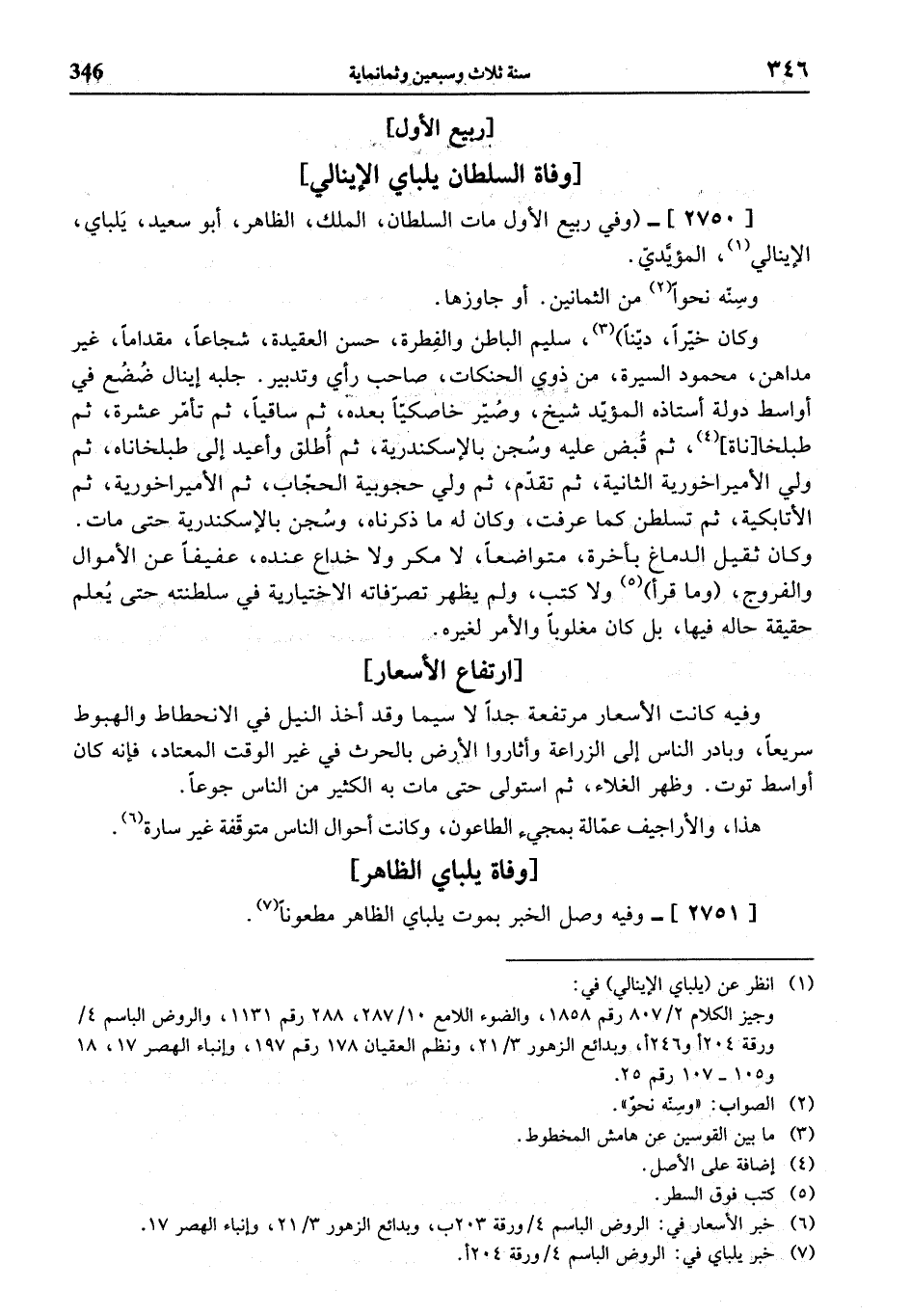 (¬1) انظر عن (يلباي الإينالي) في: وجيز الكلام 2/ 807 رقم 1858، والضوء اللامع 10/ 287، 288 رقم 1131، والروض الباسم 4 / ورقة 204 أو 246 أ، وبدائع الزهور 3/ 21، ونظم العقيان 178 رقم 197، وإنباء الهصر 17، 18 و 105 - 107 رقم 25.
