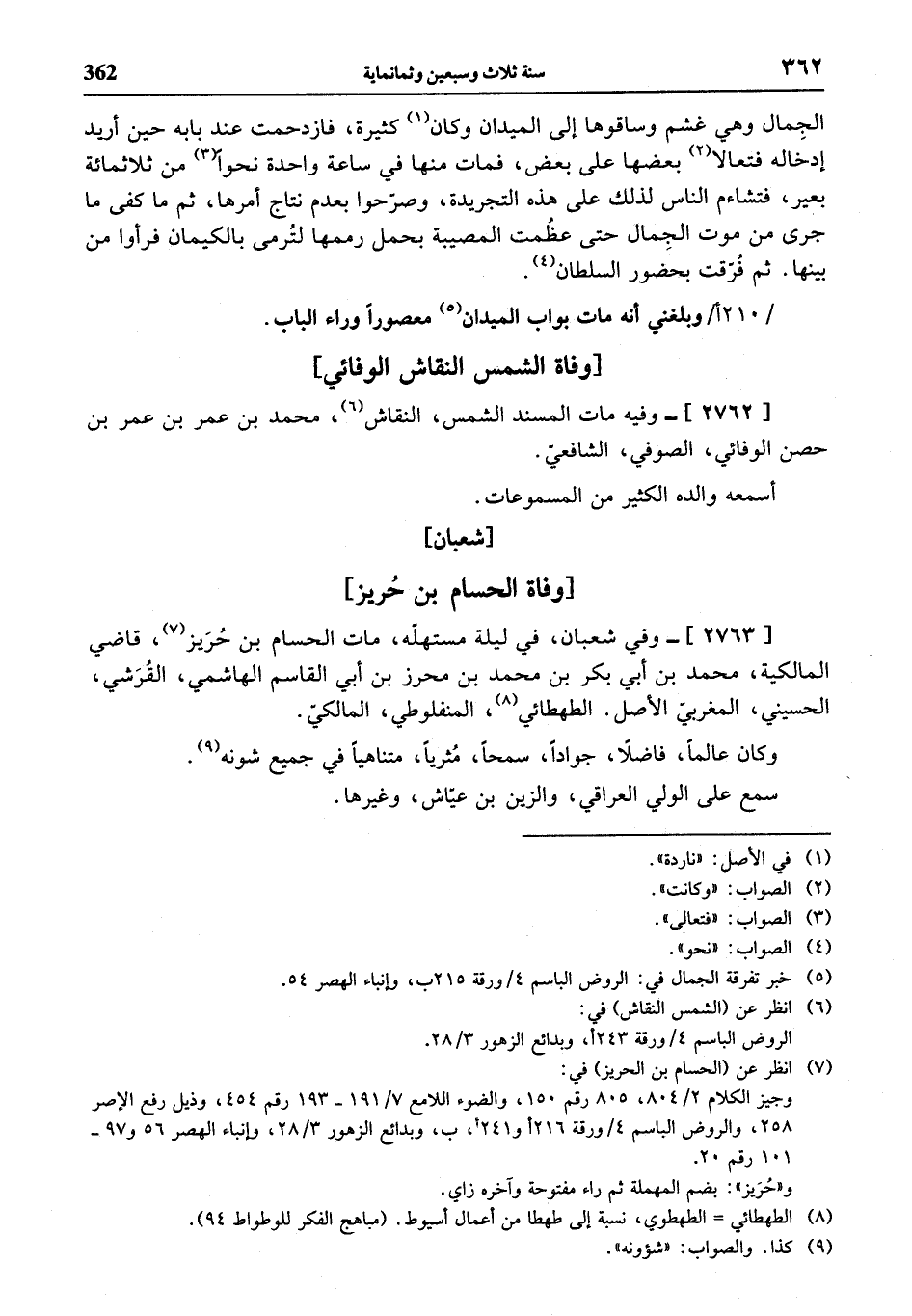 (¬6) انظر عن (الحسام بن الحريز) في: وجيز الكلام 2/ 804، 805 رقم 150، والضوء اللامع 7/ 191 - 193 رقم 454، وذيل رفع الإصر 258، والروض الباسم 4 / ورقة 216 أو 241 أ، ب، وبدائع الزهور 3/ 28، وإنباء الهصر 56 و 97 - 101 رقم 20. و «حريز»: بضم المهملة ثم راء مفتوحة وآخره زاي.