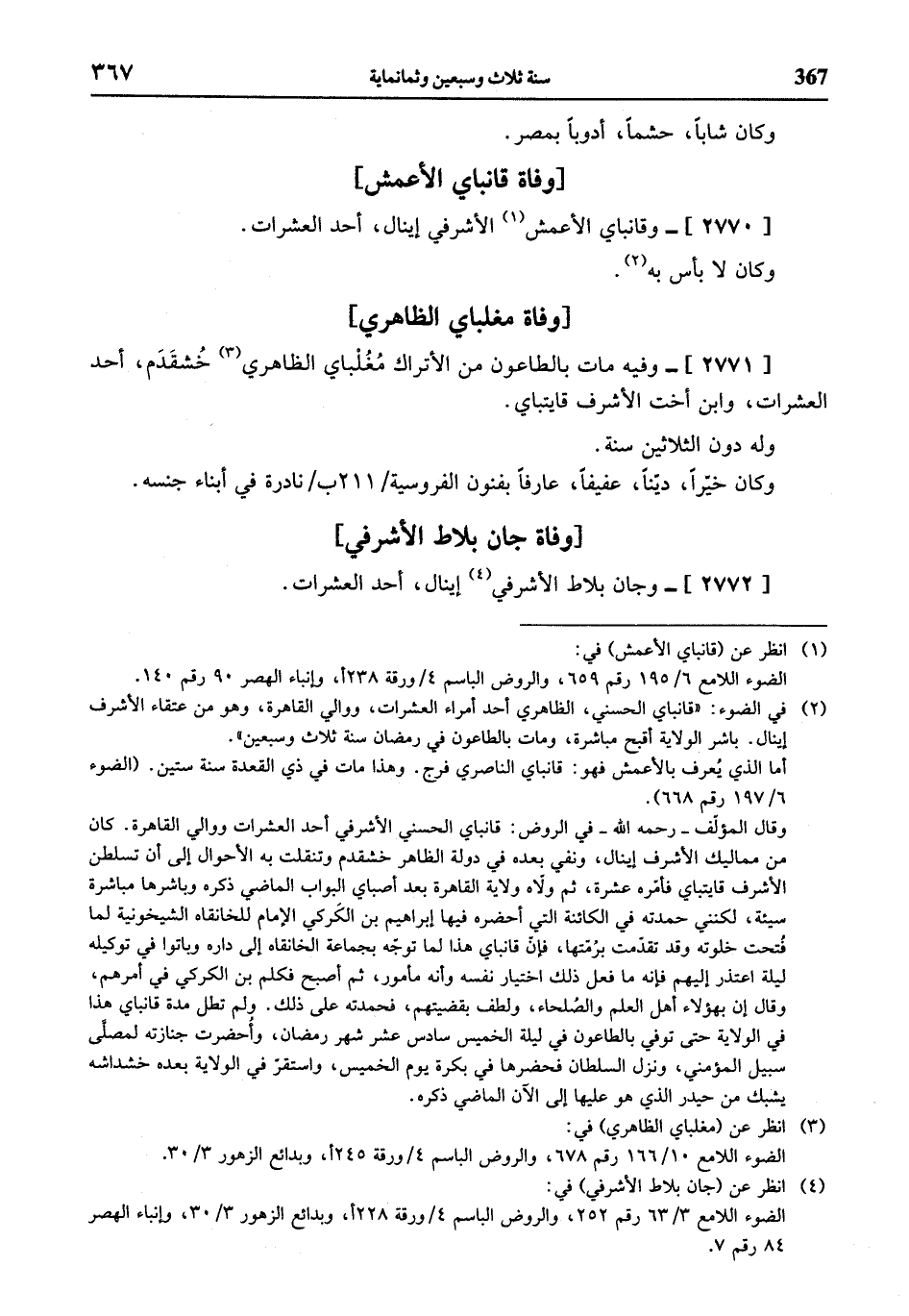 (¬4) انظر عن (جان بلاط الأشرفي) في: الضوء اللامع 3/ 63 رقم 252، والروض الباسم 4 / ورقة 228 أ، وبدائع الزهور 3/ 30، وإنباء الهصر 84 رقم 7.