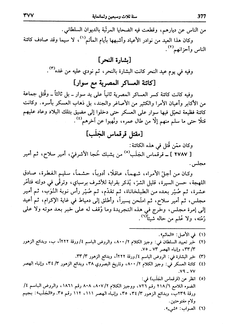 (¬5) انظر عن (قرقماس الجلب) في: الضوء اللامع 6/ 218 رقم 726، ووجيز الكلام 2/ 807، 808 رقم 1861، والروض الباسم 4 / ورقة 239 ب، وبدائع الزهور 3/ 34، 35، وإنباء الهصر 111، 112 رقم 35. و «الجلب»: بجيم ولام مفتوحتين.