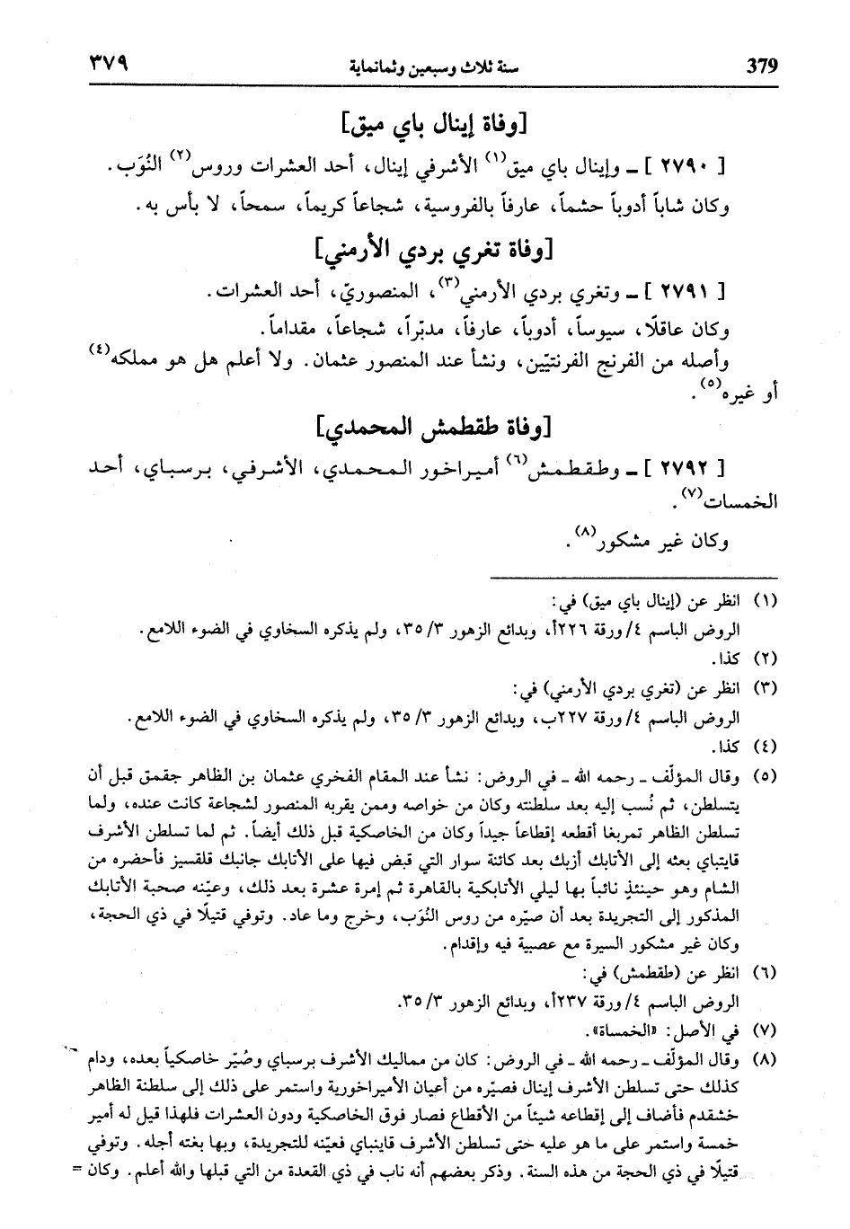(¬1) انظر عن (إينال باي ميق) في: الروض الباسم 4 / ورقة 226 أ، وبدائع الزهور 3/ 35، ولم يذكره السخاوي في الضوء اللامع.