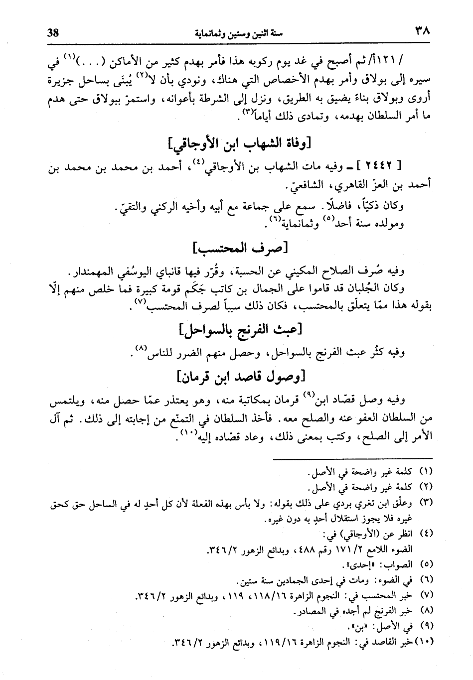 (¬7) خبر المحتسب في: النجوم الزاهرة 16/ 118، 119، وبدائع الزهور 2/ 346.