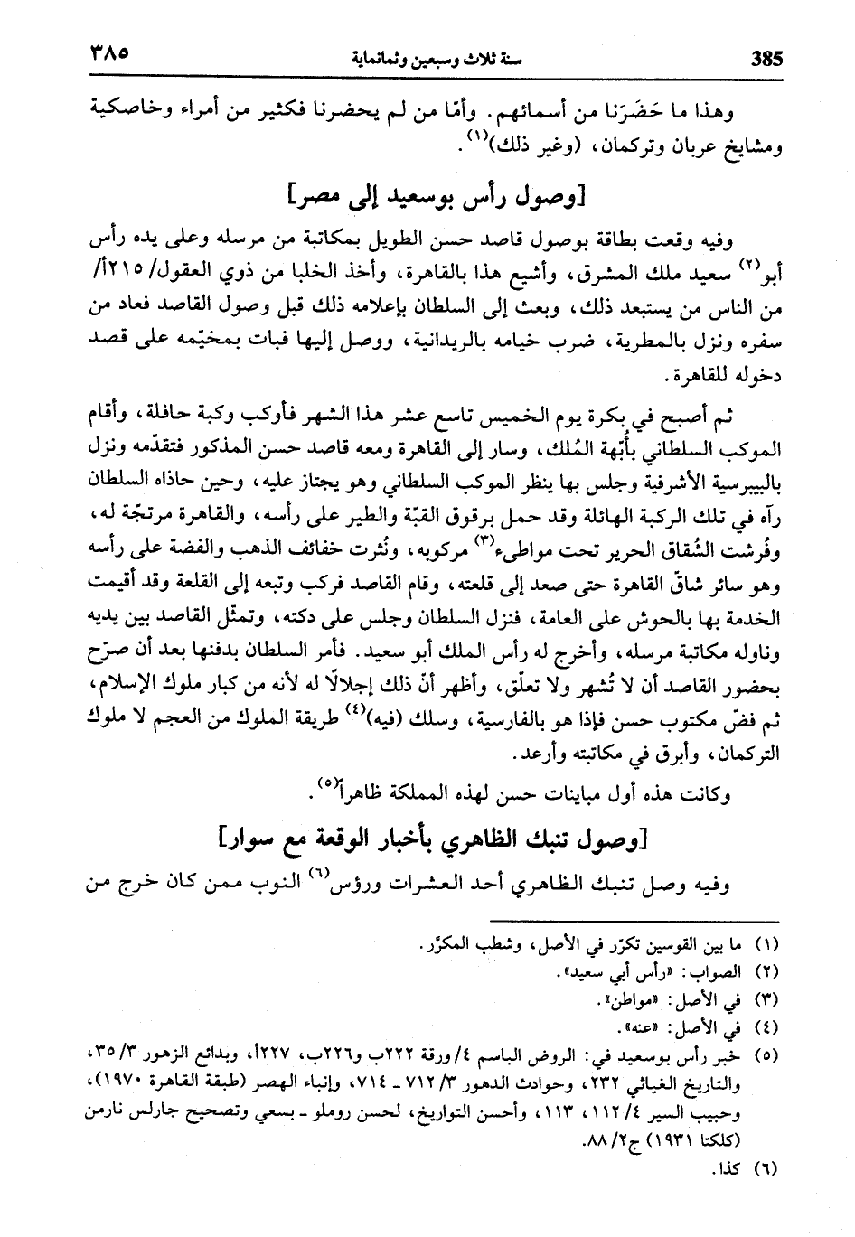 (¬5) خبر رأس بو سعيد في: الروض الباسم 4 / ورقة 222 ب و 226 ب، 227 أ، وبدائع الزهور 3/ 35، والتاريخ الغياثي 232، وحوادث الدهور 3/ 712 - 714، وإنباء الهصر (طبقة القاهرة 1970)، وحبيب السير 4/ 112، 113، وأحسن التواريخ، لحسن روملو - بسعي وتصحيح جارلس نارمن (كلكتا 1931) ج 2/ 88.