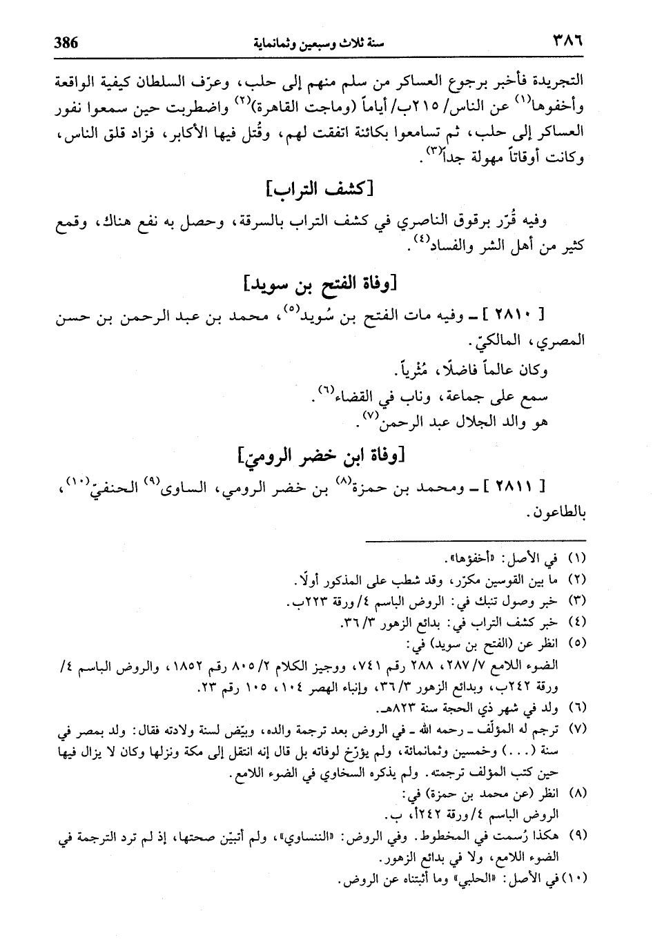 (¬5) انظر عن (الفتح بن سويد) في: الضوء اللامع 7/ 287، 288 رقم 741، ووجيز الكلام 2/ 805 رقم 1852، والروض الباسم 4 / ورقة 242 ب، وبدائع الزهور 3/ 36، وإنباء الهصر 104، 105 رقم 23.