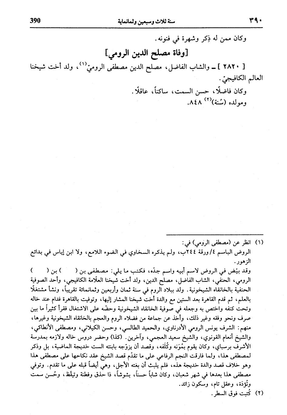 (¬1) انظر عن (مصطفى الرومي) في: الروض الباسم 4 / ورقة 244 ب، ولم يذكره السخاوي في الضوء اللامع، ولا ابن إياس في بدائع الزهور. وقد بيّض في الروض لاسم أبيه واسم جدّه، فكتب ما يلي: مصطفى بن (. . . . .) بن (. . . . .) الرومي، الحنفي، الشاب الفاضل، مصلح الدين، ولد أخت شيخنا العلاّمة الكافيجي، وأحد الصوفية الحنفية بالخانقاه الشيخونية. ولد ببلاد الروم في سنة ثمان وأربعين وثمانمائة تقريبا، ونشأ مشتغلا بالعلم، ثم قدم القاهرة بعد الستين مع والدة أخت شيخنا المشار إليها، وتوفيت بالقاهرة فدام عند خاله وتحت كنفه واختص به وجعله في صوفية الخانقاه الشيخونية وحضّه على الاشتغال فقرأ كثيرا ما بين صرف ونحو وفقه وغير ذلك، وأخذ عن جماعة من فضلاء الروم والعجم بالخانقاه الشيخونية وغيرها، منهم: الشرف يونس الرومي الأدرناوي، والحميد الطالسي، وحسن الكيلاني، ومصطفى الأنطاكي، والشيخ أنعام القونوي، والشيخ سعيد العجمي، وآخرين. (كذا) وحضر دروس خاله ولازمه بمدرسة الأشرف برسباي، وكان يقوم بمونه وكلفه، وقصد أن يزوّجه بابنته الست خديجة الماضية، بل وذكر لمصطفى هذا، ولما فارقت النجم الرفاعي على ما تقدّم قصد الشيخ عقد نكاحها على مصطفى هذا وهو خلاف قصد والدة خديجة هذه، فلم يلبث أن بغته الأجل، وهي أيضا قبله على ما تقدم. وتوفي مصطفى هذا بعدها في شهر شعبان، وكان شابا حسنا، بشوشا، ذا حذق وفطنة وتيقّظ، وحسن سمت وتؤدّة، وعقل تام، وسكون زائد.
