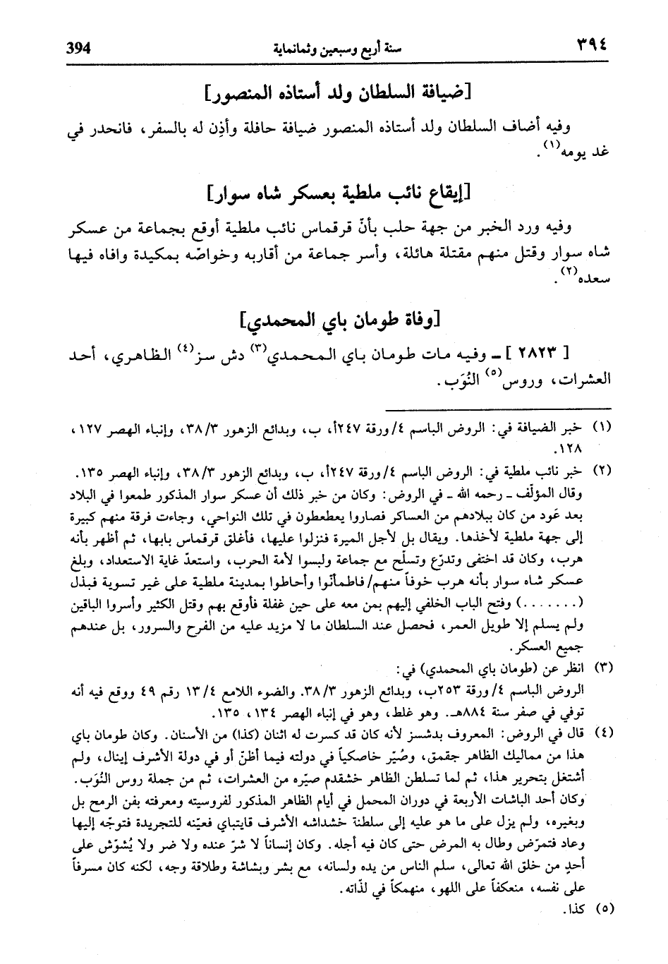 (¬3) انظر عن (طومان باي المحمدي) في: الروض الباسم 4 / ورقة 253 ب، وبدائع الزهور 3/ 38. والضوء اللامع 4/ 13 رقم 49 ووقع فيه أنه توفي في صفر سنة 884 هـ. وهو غلط، وهو في إنباء الهصر 134، 135.