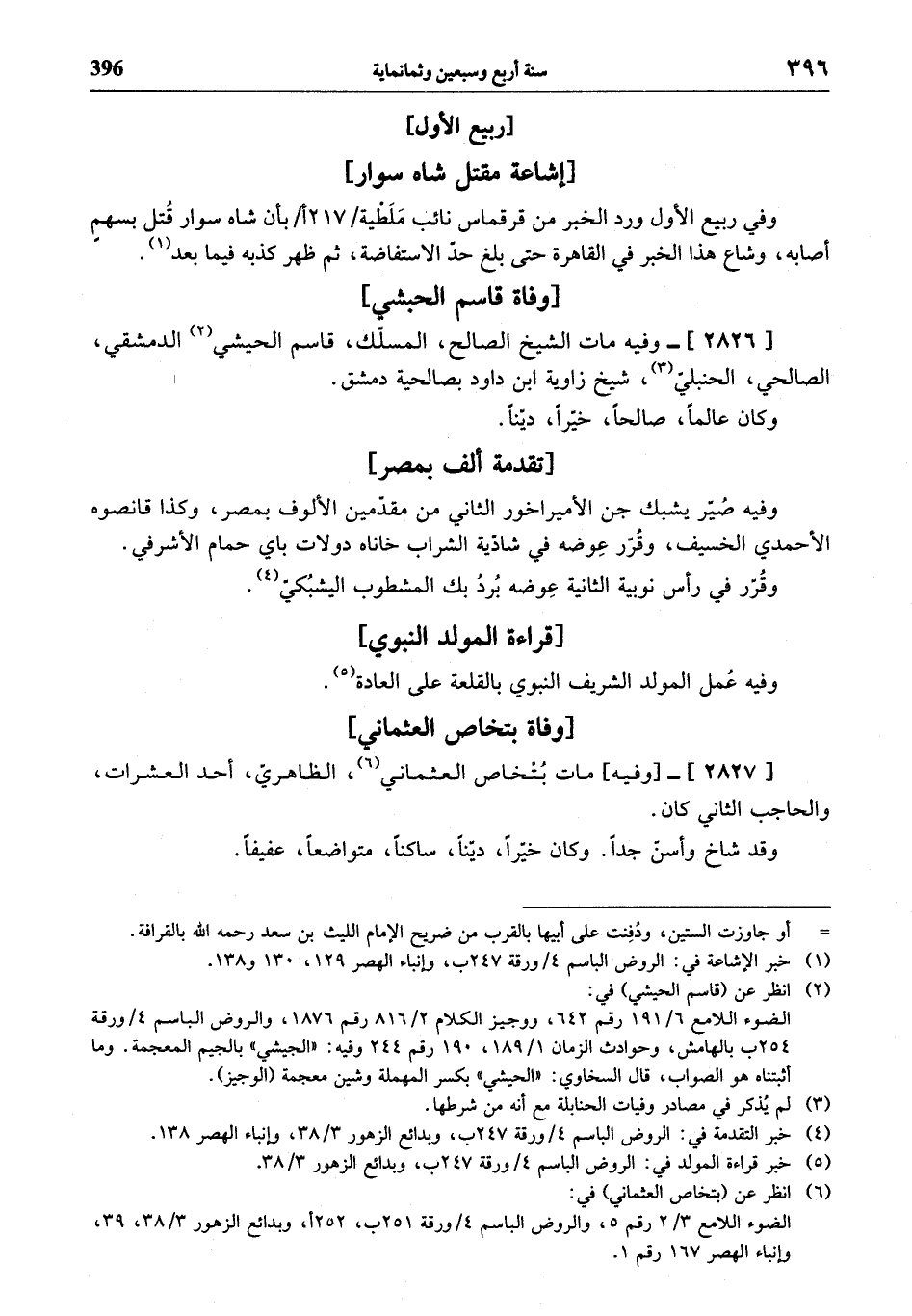 (¬6) انظر عن (بتخاص العثماني) في: الضوء اللامع 3/ 2 رقم 5، والروض الباسم 4 / ورقة 251 ب، 252 أ، وبدائع الزهور 3/ 38، 39، وإنباء الهصر 167 رقم 1.
