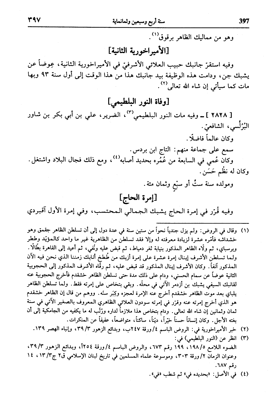 (¬3) انظر عن (النور البلطيمي) في: الضوء اللامع 5/ 198، 199 رقم 673، والروض الباسم 4 / ورقة 254 أ، وبدائع الزهور 3/ 39، وعنوان الزمان 2 / ورقة 303، وموسوعة علماء المسلمين في تاريخ لبنان الإسلامي ق 2 ج 3/ 13، 14 رقم 687.