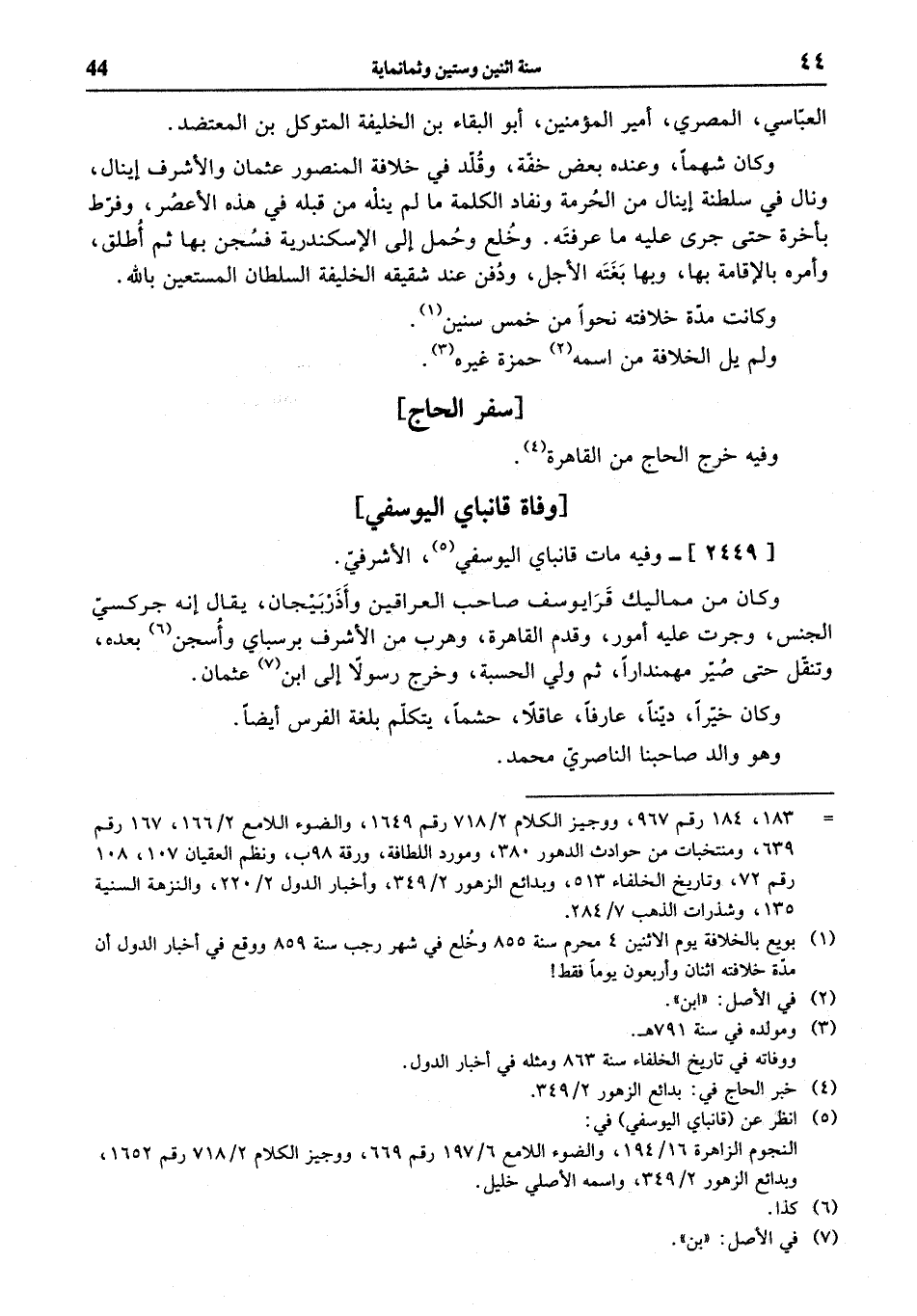 (¬1) بويع بالخلافة يوم الاثنين 4 محرم سنة 855 وخلع في شهر رجب سنة 859 ووقع في أخبار الدول أن مدّة خلافته اثنان وأربعون يوما فقط!