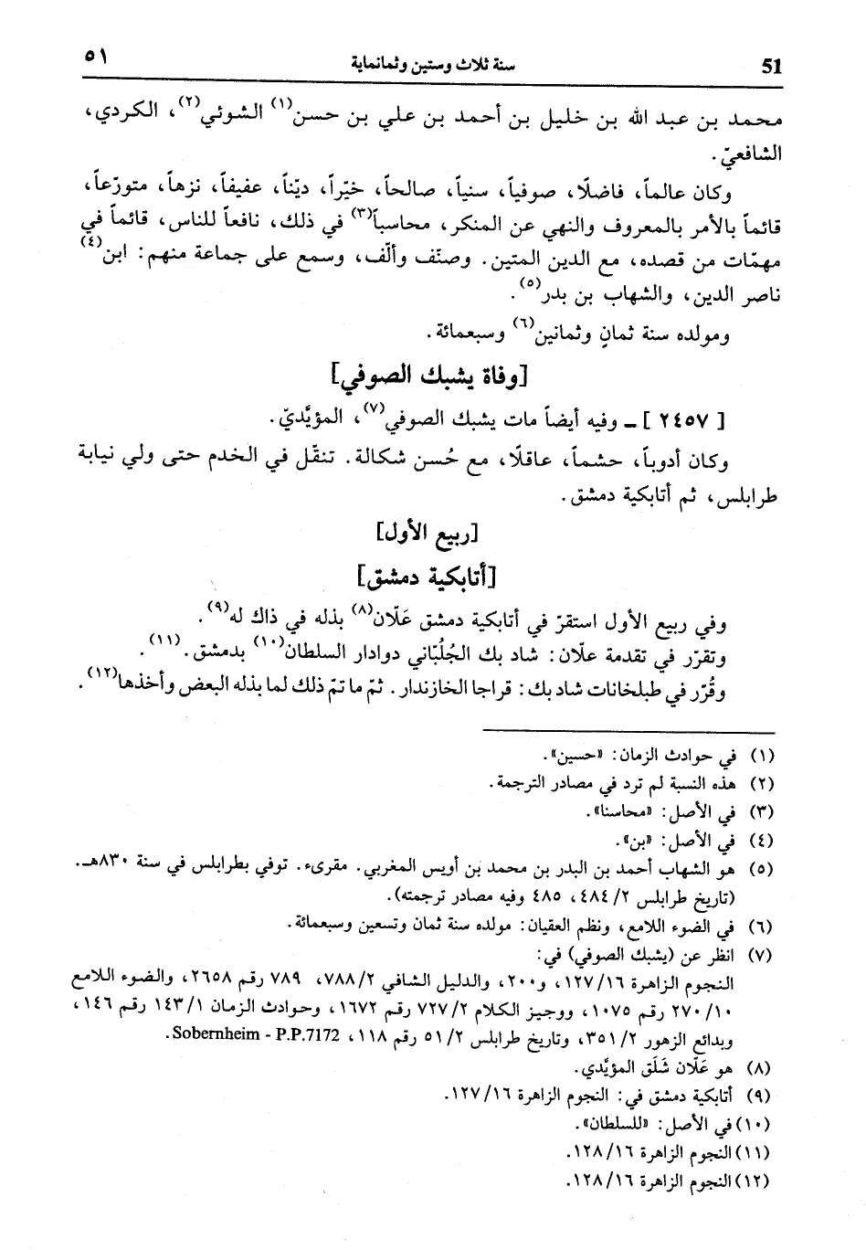 (¬7) انظر عن (يشبك الصوفي) في: النجوم الزاهرة 16/ 127، و 200، والدليل الشافي 2/ 788، 789 رقم 2658، والضوء اللامع 10/ 270 رقم 1075، ووجيز الكلام 2/ 727 رقم 1672، وحوادث الزمان 1/ 143 رقم 146، وبدائع الزهور 2/ 351، وتاريخ طرابلس 2/ 51 رقم 118، Sobernheim - P.P. 7172.