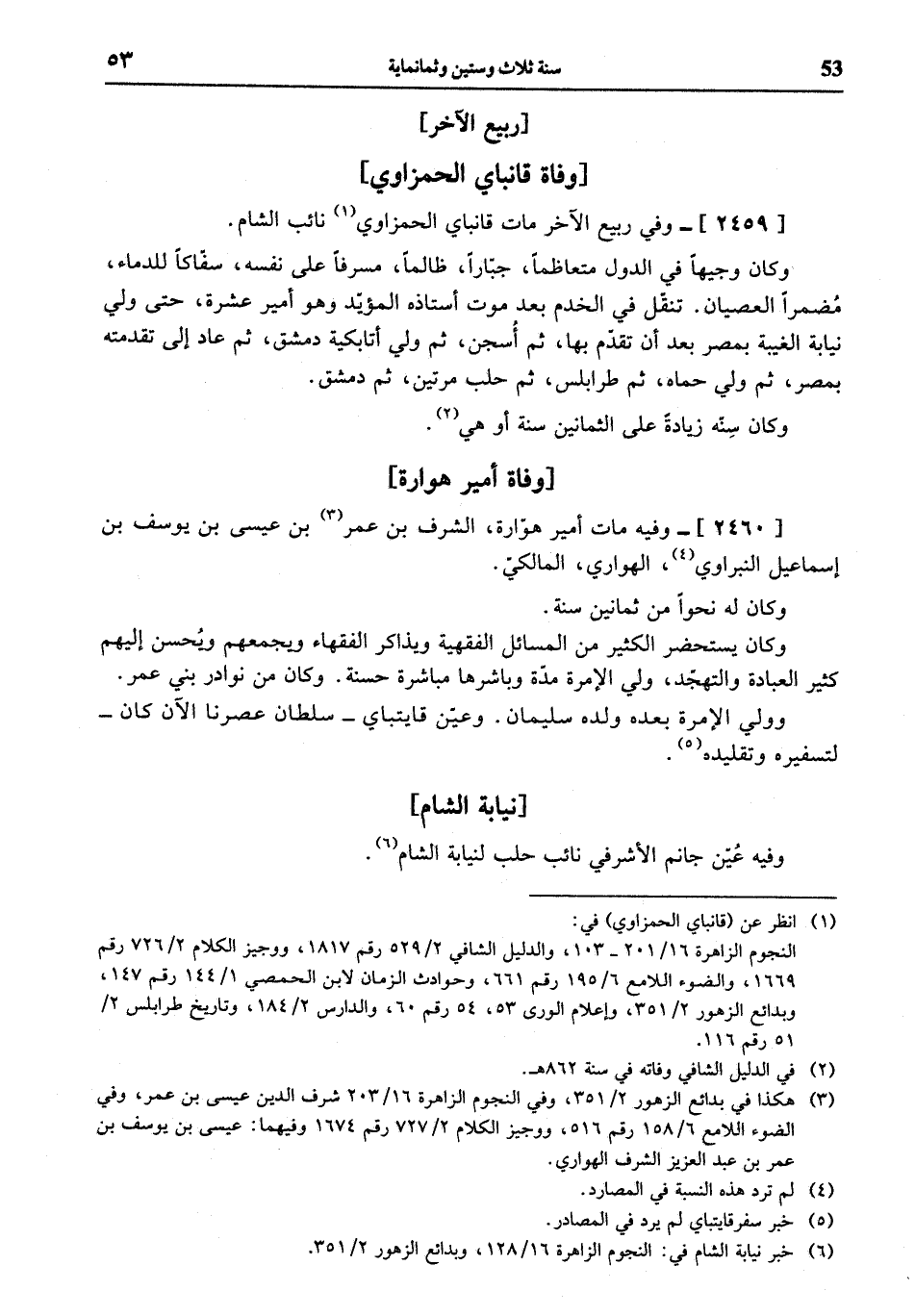 (¬1) انظر عن (قانباي الحمزاوي) في: النجوم الزاهرة 16/ 201 - 103، والدليل الشافي 2/ 529 رقم 1817، ووجيز الكلام 2/ 726 رقم 1669، والضوء اللامع 6/ 195 رقم 661، وحوادث الزمان لابن الحمصي 1/ 144 رقم 147، وبدائع الزهور 2/ 351، وإعلام الورى 53، 54 رقم 60، والدارس 2/ 184، وتاريخ طرابلس 2/ 51 رقم 116.