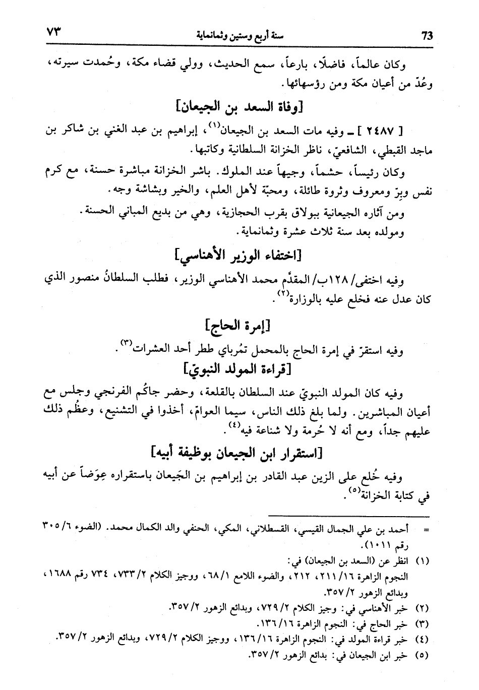 (¬1) انظر عن (السعد بن الجيعان) في: النجوم الزاهرة 16/ 211، 212، والضوء اللامع 1/ 68، ووجيز الكلام 2/ 733، 734 رقم 1688، وبدائع الزهور 2/ 357.