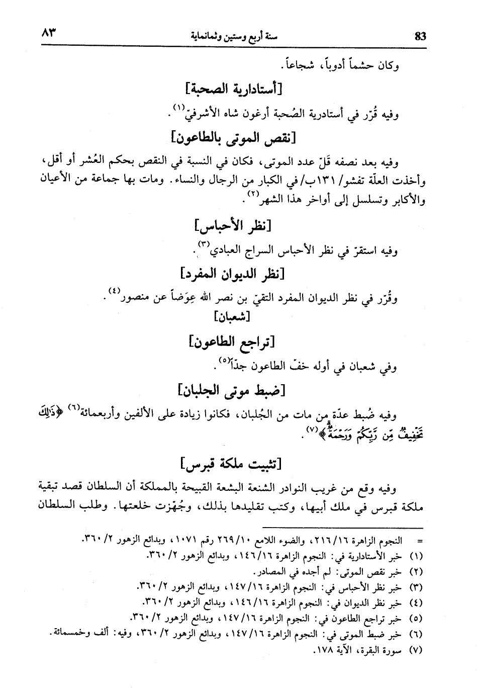 (¬4) خبر نظر الديوان في: النجوم الزاهرة 16/ 146، وبدائع الزهور 2/ 360.