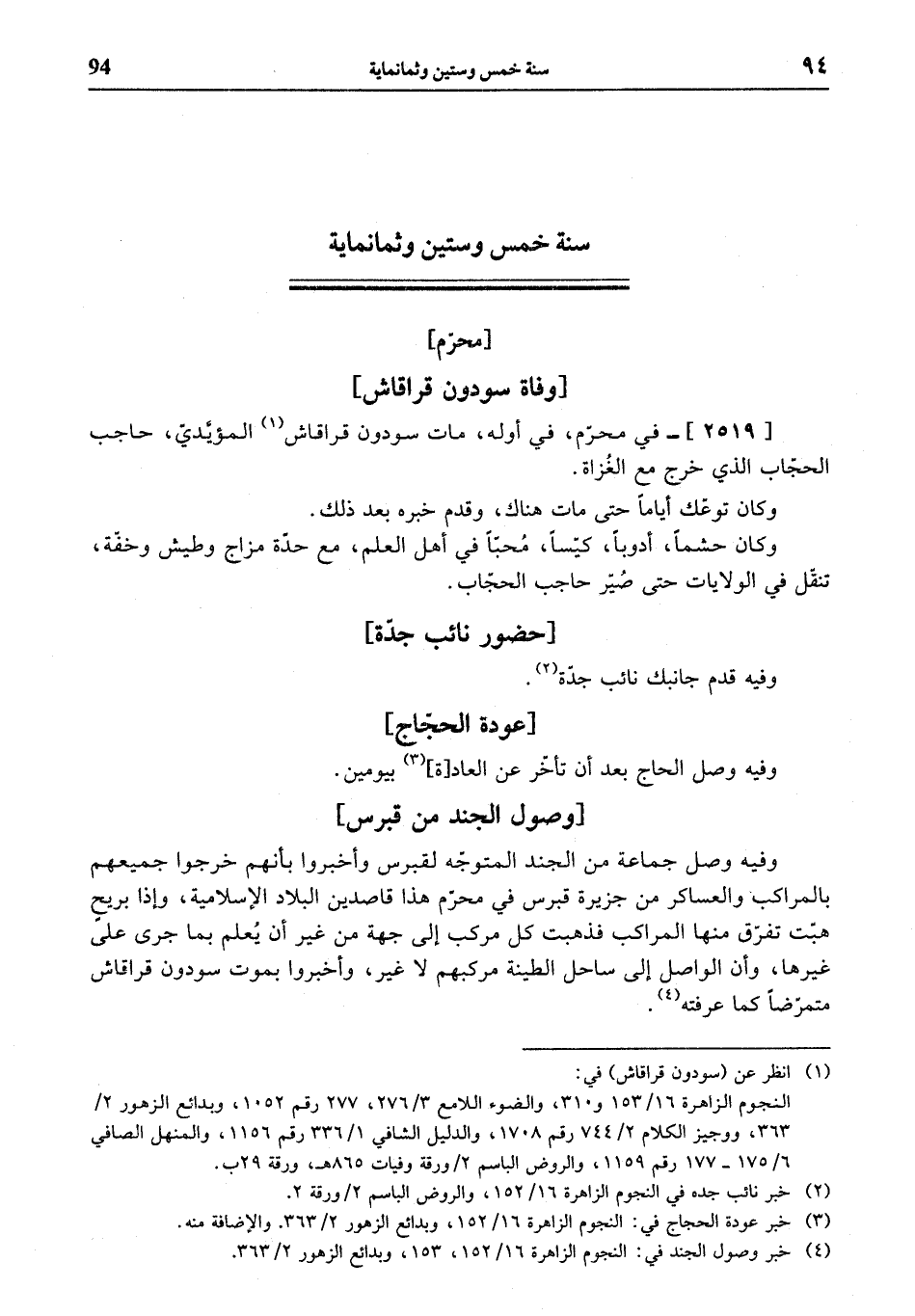 [2519]- في محرّم، في أوله، مات سودون قراقاش (¬1) المؤيّديّ، حاجب الحجّاب الذي خرج مع الغزاة.