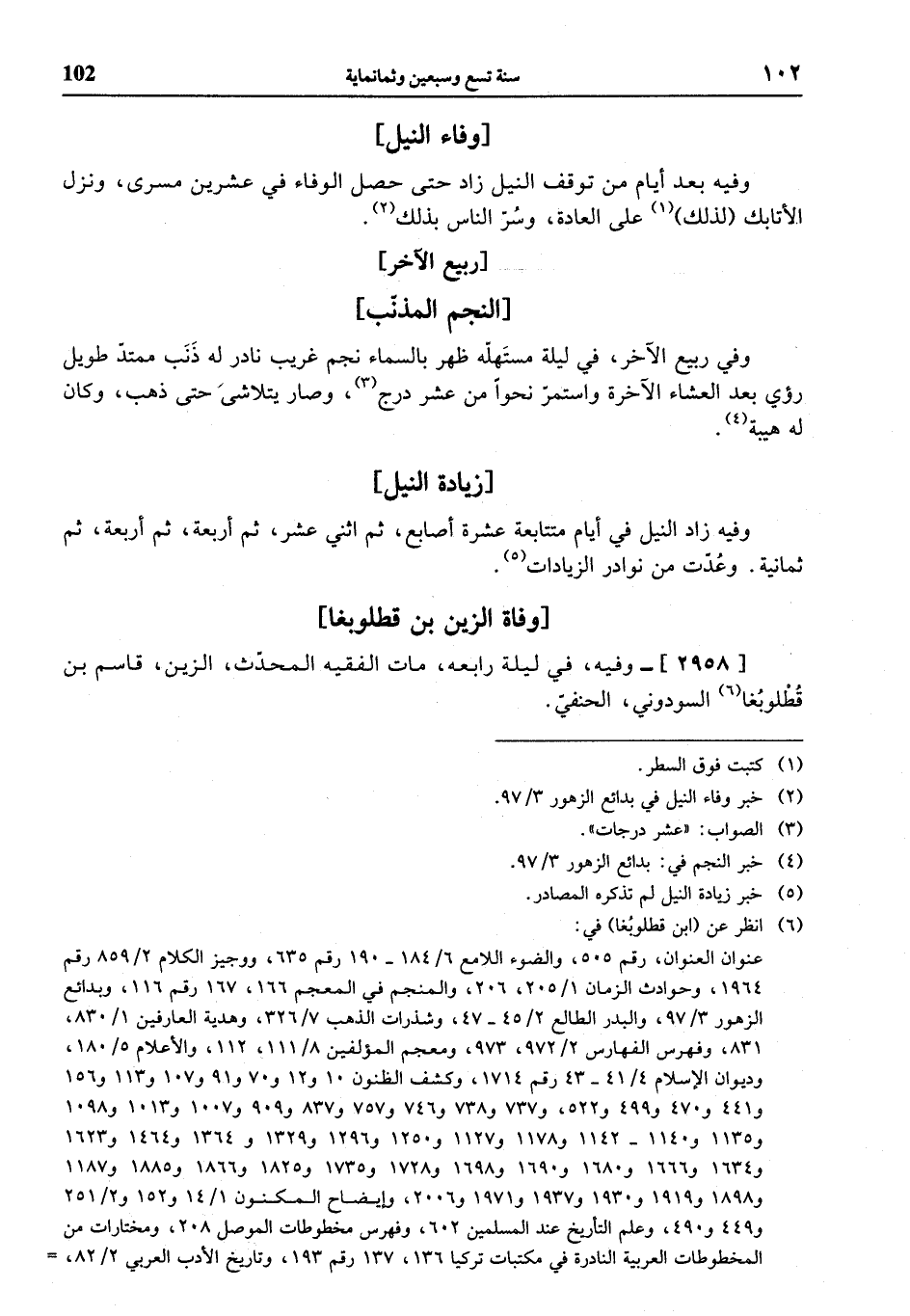 (¬6) انظر عن (ابن قطلوبغا) في: عنوان العنوان، رقم 505، والضوء اللامع 6/ 184 - 190 رقم 635، ووجيز الكلام 2/ 859 رقم 1964، وحوادث الزمان 1/ 205، 206، والمنجم في المعجم 166، 167 رقم 116، وبدائع الزهور 3/ 97، والبدر الطالع 2/ 45 - 47، وشذرات الذهب 7/ 326، وهدية العارفين 1/ 830، 831، وفهرس الفهارس 2/ 972، 973، ومعجم المؤلفين 8/ 111، 112، والأعلام 5/ 180، وديوان الإسلام 4/ 41 - 43 رقم 1714، وكشف الظنون 10 و 12 و 70 و 91 و 107 و 113 و 156 و 441 و 470 و 499 و 522، و 737 و 738 و 746 و 757 و 837 و 909 و 1007 و 1013 و 1098 و 1135 و 1140 - 1142 و 1178 و 1127 و 1250 و 1296 و 1329 و 1364 و 1464 و 1623 و 1634 و 1666 و 1680 و 1690 و 1698 و 1728 و 1735 و 1825 و 1866 و 1885 و 1187 و 1898 و 1919 و 1930 و 1937 و 1971 و 2006، وإيضاح المكنون 1/ 14 و 152 و 2/ 251 و 449 و 490، وعلم التأريخ عند المسلمين 602، وفهرس مخطوطات الموصل 208، ومختارات من المخطوطات العربية النادرة في مكتبات تركيا 136، 137 رقم 193، وتاريخ الأدب العربي 2/ 82، =