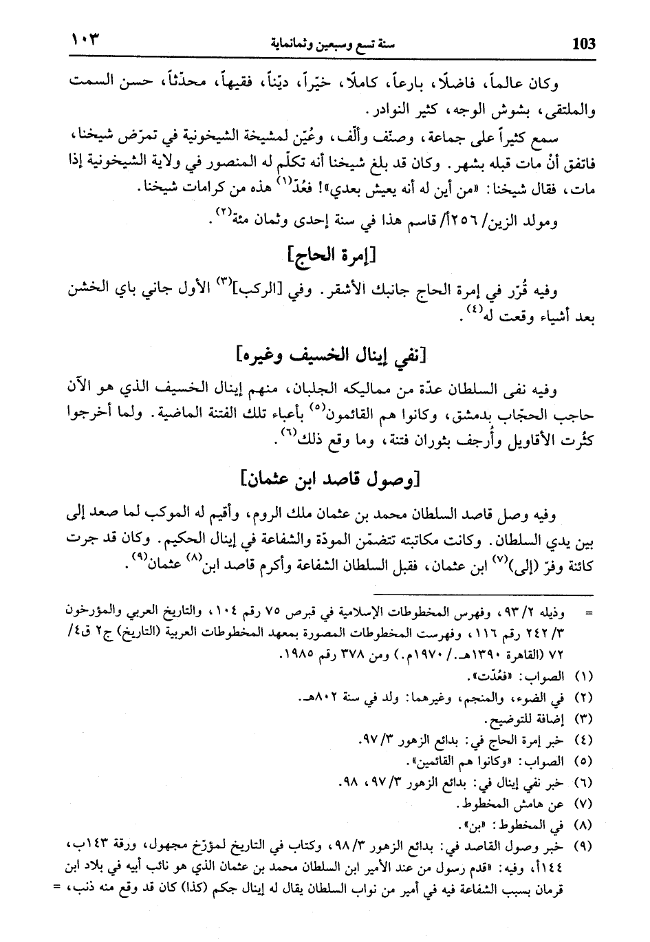 (¬9) خبر وصول القاصد في: بدائع الزهور 3/ 98، وكتاب في التاريخ لمؤرّخ مجهول، ورقة 143 ب، 144 أ، وفيه: «قدم رسول من عند الأمير ابن السلطان محمد بن عثمان الذي هو نائب أبيه في بلاد ابن قرمان بسبب الشفاعة فيه في أمير من نواب السلطان يقال له إينال جكم (كذا) كان قد وقع منه ذنب، =
