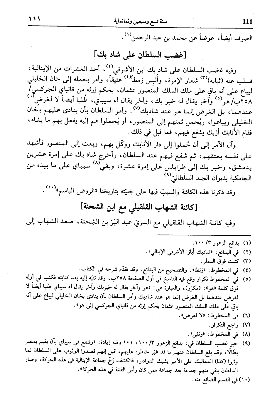 (¬9) خبر غضب السلطان في: بدائع الزهور 3/ 100، 101 وفيه زيادة: «وشفع في سيباي بأن يقيم بمصر بطّالا، وقد بلغ السلطان عنهم ما قد غيّر خاطره عليهم، قيل إنهم قصدوا الوثوب على السلطان لما وثبوا (كذا) المماليك على الأمير يشبك الدوادار، فانكشف رخّ جماعة الإينالية في هذه الحركة، وصار السلطان ينفي منهم جماعة بعد جماعة ممن كان رأس الفتنة في هذه الحركة».