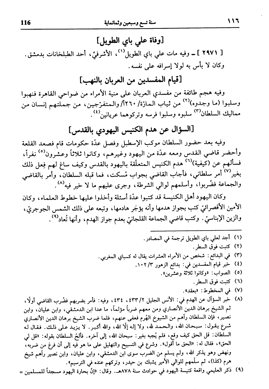 (¬9) ذكر العليمي واقعة كنيسة اليهود في حوادث سنة 878 هـ. وقال: "إن بحارة اليهود مسجدا للمسلمين