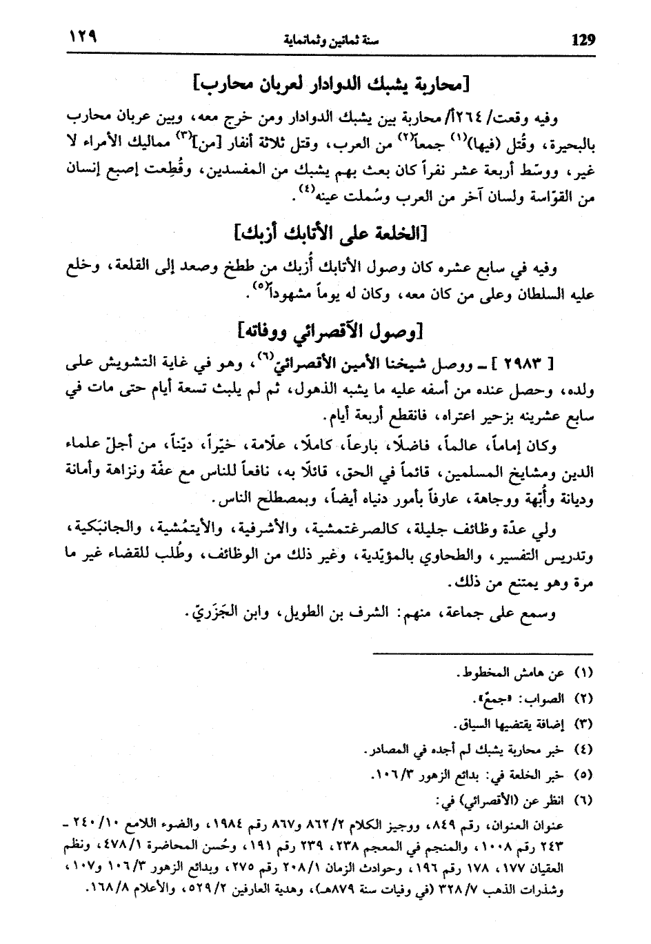 (¬6) انظر عن (الأقصرائي) في: عنوان العنوان، رقم 849، ووجيز الكلام 2/ 862 و 867 رقم 1984، والضوء اللامع 10/ 240 - 243 رقم 1008، والمنجم في المعجم 238، 239 رقم 191، وحسن المحاضرة 1/ 478، ونظم العقيان 177، 178 رقم 196، وحوادث الزمان 1/ 208 رقم 275، وبدائع الزهور 3/ 106 و 107، وشذرات الذهب 7/ 328 (في وفيات سنة 879 هـ)، وهدية العارفين 2/ 529، والأعلام 8/ 168.