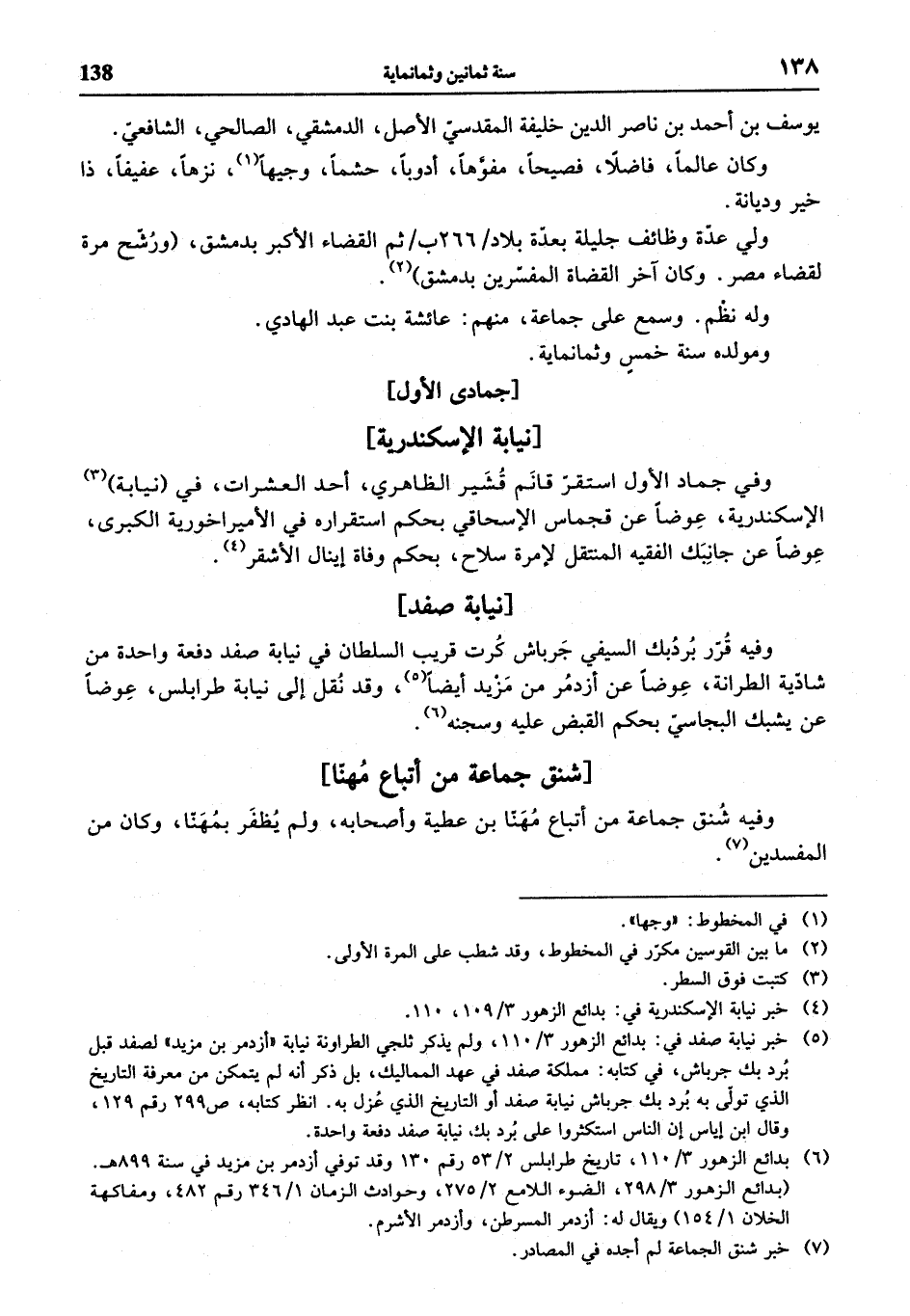 (¬6) بدائع الزهور 3/ 110، تاريخ طرابلس 2/ 53 رقم 130 وقد توفي أزدمر بن مزيد في سنة 899 هـ. (بدائع الزهور 3/ 298، الضوء اللامع 2/ 275، وحوادث الزمان 1/ 346 رقم 482، ومفاكهة الخلان 1/ 154) ويقال له: أزدمر المسرطن، وأزدمر الأشرم.