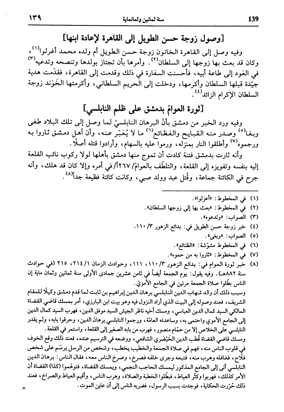(¬8) خبر ثورة العوام في: بدائع الزهور 3/ 110، 111، وحوادث الزمان 1/ 214، 215 (في حوادث سنة 882 هـ). وفيه يقول: يوم الجمعة أيضا في ثامن عشرين جمادى الأولى سنة ثمانين وثمان ماية إن الناس بطّلوا صلاة الجمعة مرتين في الجامع الأمويّ. وسبب ذلك أن والد شهاب الدين النابلسي برهان الدين إبراهيم بن ثابت لما قدم دمشق وكيلا للمقام الشريف، فعند وصوله إلى البيت الذي أراد النزول فيه وهو بيت ابن البارزي، أمر بمسك قاضي القضاة المالكي السيد كمال الدين العباسي، ومسك أخيه ناظر الجيش السيد موفق الدين، فهرب السيد كمال الدين إلى الجامع الأموي واحتمى به، وساعدته العامّة، ورجموا النابلسيّ برهان الدين، وحرقوا بابه، ولم يقدر النابلسي على الخلاص إلا من حمّام منصور، فهرب من بابه الصغير إلى القلعة، واستمر في القلعة. ومسك قاضي القضاة قطب الدين الخيضري الشافعي، ووضعه في الترسيم عنده، فعند ذلك وقع الخوف في قلوب الناس منه، فهم في صلاة الجمعة والخطيب يخطب، وشخص من الرسل يرسّم على شخص فلاّح، فغافله وهرب منه، فتبعه وجرى خلفه فصرخ، وصرخ الناس معه، فقال الناس: برهان الدين النابلسي أتى إلى الجامع المذكور ليمسك الحاجب النجمي، ويمسك القضاة، فتوهّموا (كذا) القضاة أن الأمر كذلك، فهربوا وكثر العياط، فبطّلوا الخطبة والصلاة، وهرب الناس، وأقيم العياط والصراخ، فعند ذلك حرّرت الحكاية، فوجدت بسبب الرسول، فضربه الناس إلى أن عاين الموت. =