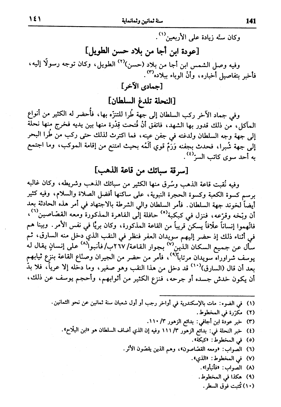وفيه نقبت قاعة الذهب وسرق منها الكثير من سبائك الذهب وشريطه، وكان غالبه برسم كسوة الكعبة وكسوة الحجرة النبوية، على ساكنها أفضل الصلاة والسلام، وفيه كثير أيضا لخوند جهة السلطان. فأمر السلطان والي الشرطة بالاجتهاد في أمر هذه الحادثة بعد أن وبّخه وقرّعه، فنزل في كبكبة (¬5) حافلة إلى القاهرة المذكورة ومعه القصّاصين (¬6)، فاتّهموا إنسانا علاّفا يسكن قريبا من القاعة المذكورة، وكان بريّا في نفس الأمر. وبينا هم في أثناء ذلك إذ حضر إليهم سويدان العفر فنظر في النقب الذي دخل منه السارق، ثم سأل عن جميع السكان الذين (¬7) بجوار القاعة / 267 ب / فأنبوا (¬8) على إنسان يقال له يوسف شراوراه سويدان مرتابا (¬9)، فأمر من حضر من الجيران وصنّاع القاعة بنزع ثيابهم بعد أن قال (السارق) (¬10) قد دخل من هذا النقب وهو صغير، وما دخله إلا عريا، فلا بدّ أن يكون خدش جسده أو جرحه، فنزع الكثير من أثوابهم، وأحجم يوسف عن ذلك،