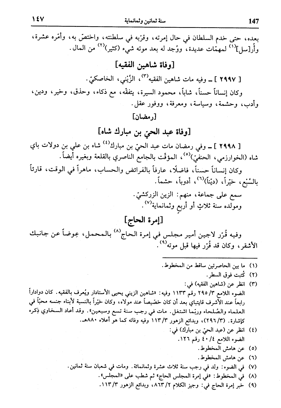 (¬3) انظر عن (شاهين الفقيه) في: الضوء اللامع 3/ 295 رقم 1133 وفيه: «شاهين الزيني يحيى الأستادار ويعرف بالفقيه. كان دوادارا رابعا عند الأشرف قايتباي بعد أن كان خصّيصا عند مولاه، وكان خيّرا بالنسبة لأبناء جنسه محبّا في العلماء والصلحاء وربّما اشتغل. مات في رجب سنة تسع وسبعين». وقد أعاد السخاوي ذكره كإشارة. (3/ 296)، وبدائع الزهور 3/ 113 وفيه وفاته كما هو أعلاه 880 هـ.