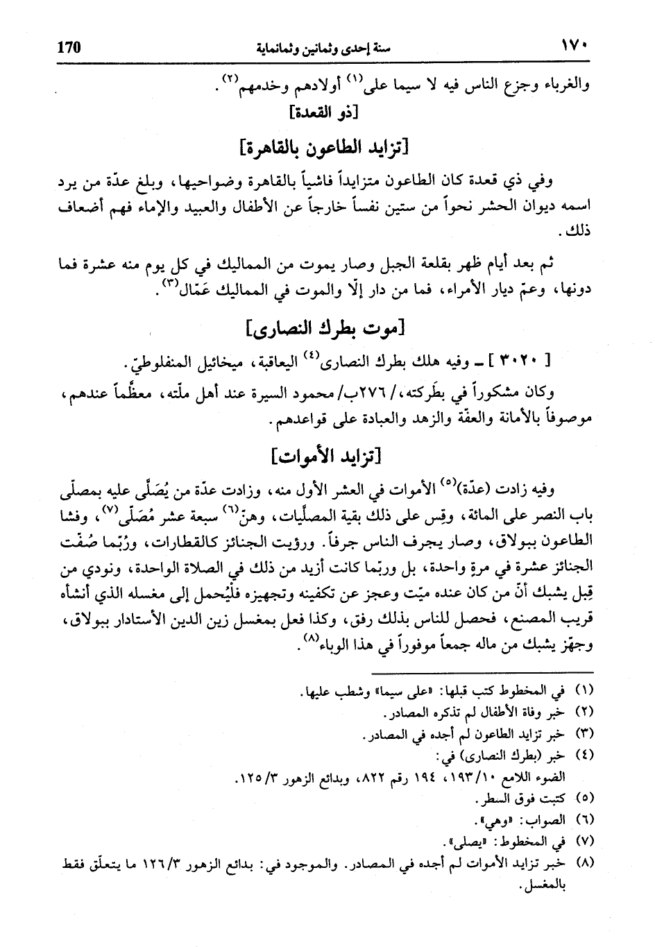 (¬8) خبر تزايد الأموات لم أجده في المصادر. والموجود في: بدائع الزهور 3/ 126 ما يتعلّق فقط بالمغسل.