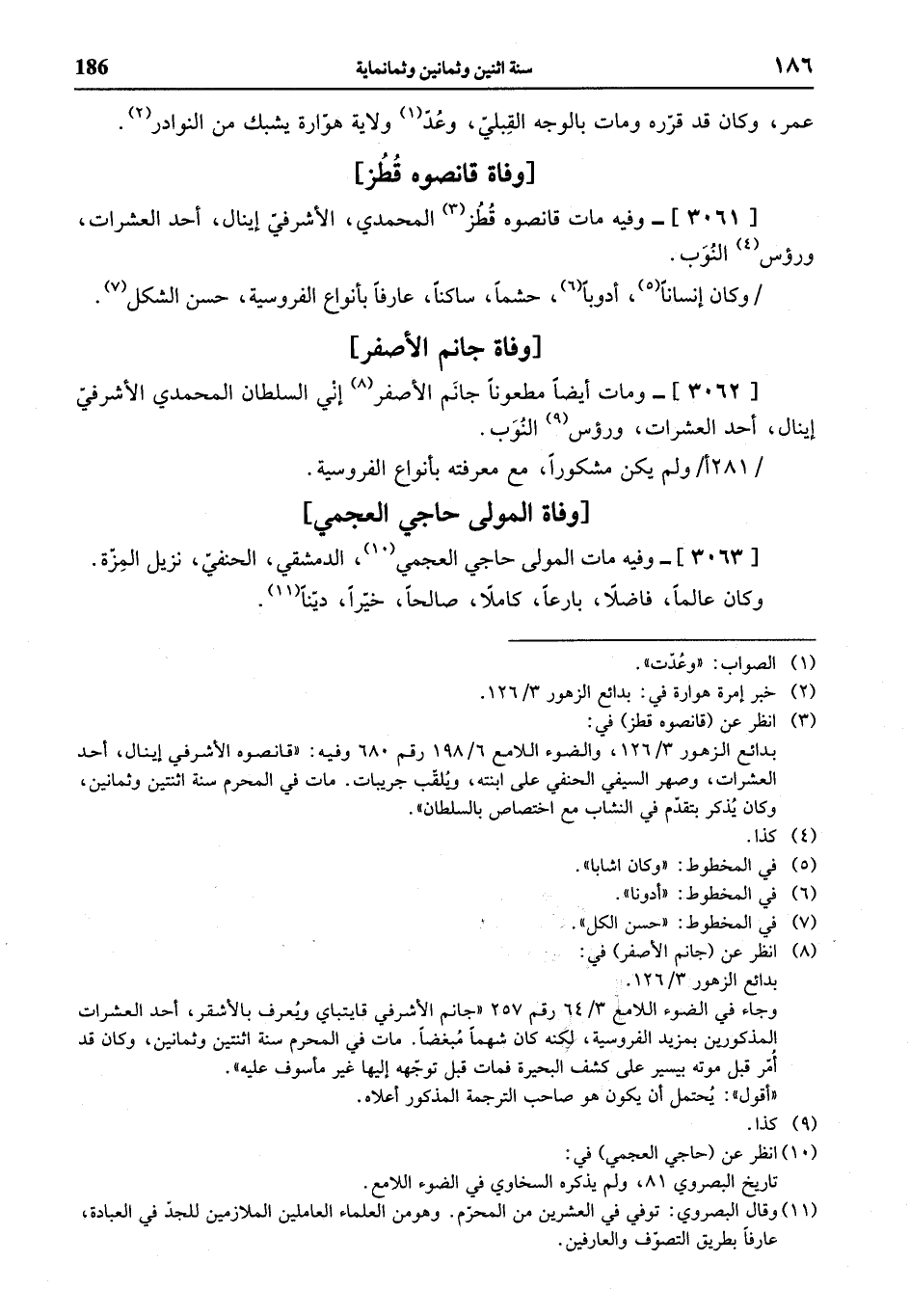 (¬8) انظر عن (جانم الأصفر) في: بدائع الزهور 3/ 126. وجاء في الضوء اللامع 3/ 64 رقم 257 «جانم الأشرفيّ قايتباي ويعرف بالأشقر، أحد العشرات المذكورين بمزيد الفروسية، لكنه كان شهما مبغضا. مات في المحرم سنة اثنتين وثمانين، وكان قد أمّر قبل موته بيسير على كشف البحيرة فمات قبل توجّهه إليها غير مأسوف عليه». «أقول»: يحتمل أن يكون هو صاحب الترجمة المذكور أعلاه.