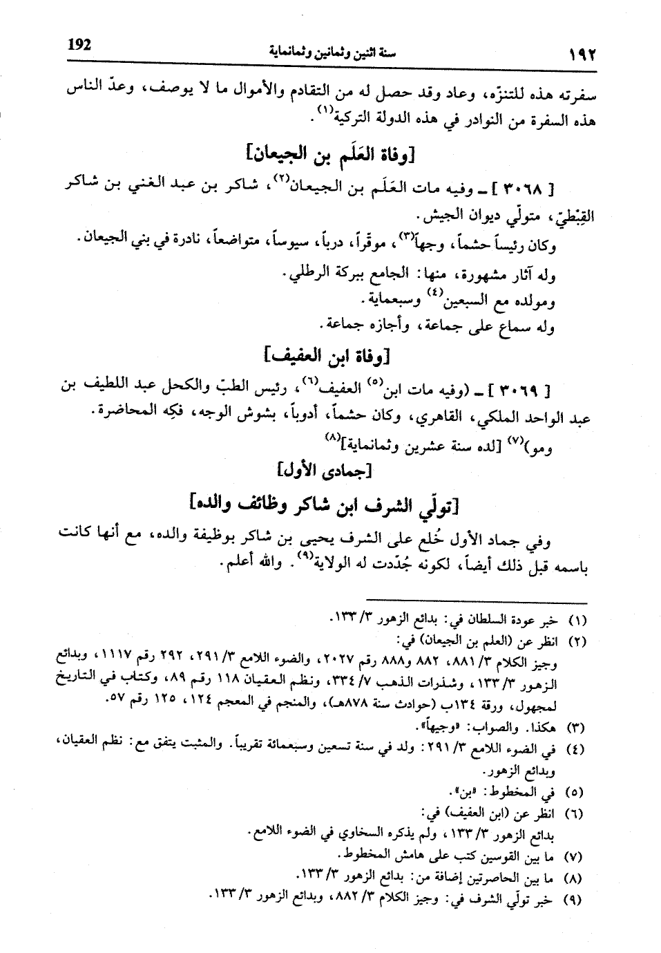 (¬2) انظر عن (العلم بن الجيعان) في: وجيز الكلام 3/ 881، 882 و 888 رقم 2027، والضوء اللامع 3/ 291، 292 رقم 1117، وبدائع الزهور 3/ 133، وشذرات الذهب 7/ 334، ونظم العقيان 118 رقم 89، وكتاب في التاريخ لمجهول، ورقة 134 ب (حوادث سنة 878 هـ)، والمنجم في المعجم 124، 125 رقم 57.