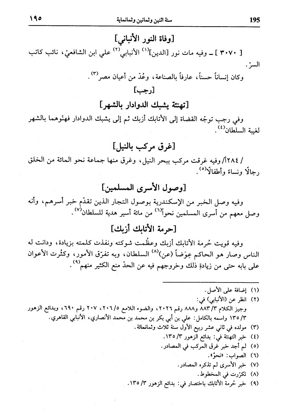 (¬2) انظر عن (الأنبابي) في: وجيز الكلام 3/ 883 و 888 رقم 2026، والضوء اللامع 5/ 206، 207 رقم 690، وبدائع الزهور 3/ 135 واسمه بالكامل: علي بن أبي بكر بن محمد بن محمد الأنصاري، الأنبابي القاهري.