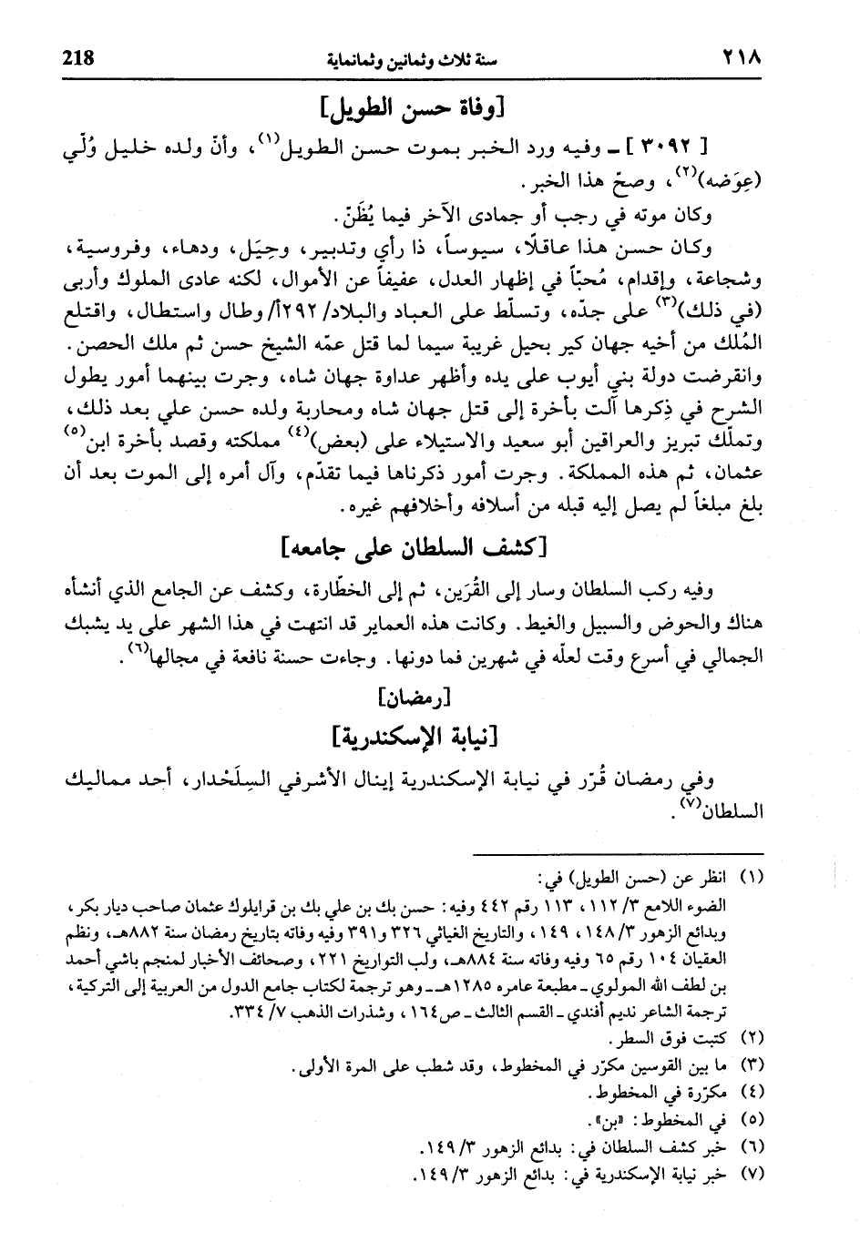 (¬1) انظر عن (حسن الطويل) في: الضوء اللامع 3/ 112، 113 رقم 442 وفيه: حسن بك بن علي بك بن قرايلوك عثمان صاحب ديار بكر، وبدائع الزهور 3/ 148، 149، والتاريخ الغياثي 326 و 391 وفيه وفاته بتاريخ رمضان سنة 882 هـ، ونظم العقيان 104 رقم 65 وفيه وفاته سنة 884 هـ، ولب التواريخ 221، وصحائف الأخبار لمنجم باشي أحمد بن لطف الله المولوي - مطبعة عامره 1285 هـ - وهو ترجمة لكتاب جامع الدول من العربية إلى التركية، ترجمة الشاعر نديم أفندي - القسم الثالث - ص 164، وشذرات الذهب 7/ 334.