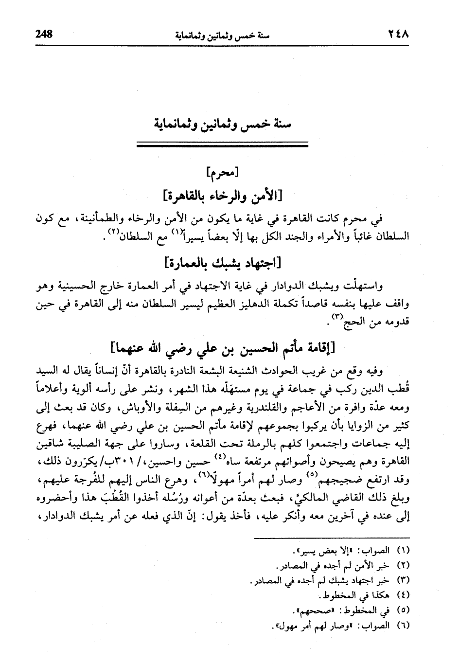 وفيه وقع من غريب الحوادث الشنيعة البشعة النادرة بالقاهرة أنّ إنسانا يقال له السيد قطب الدين ركب في جماعة في يوم مستهلّه هذا الشهر، ونشر على رأسه ألوية وأعلاما ومعه عدّة وافرة من الأعاجم والقلندرية وغيرهم من السفلة والأوباش، وكان قد بعث إلى كثير من الزوايا بأن يركبوا بجموعهم لإقامة مأتم الحسين بن علي رضي الله عنهما، فهرع إليه جماعات واجتمعوا كلهم بالرملة تحت القلعة، وساروا على جهة الصليبة شاقين القاهرة وهم يصيحون وأصواتهم مرتفعة ساه (¬4) حسين وا حسين، / 301 ب / يكرّرون ذلك، وقد ارتفع ضجيجهم (¬5) وصار لهم أمرا مهولا (¬6)، وهرع الناس إليهم للفرجة عليهم، وبلغ ذلك القاضي المالكيّ، فبعث بعدّة من أعوانه ورسله أخذوا القطب هذا وأحضروه إلى عنده في آخرين معه وأنكر عليه، فأخذ يقول: إنّ الذي فعله عن أمر يشبك الدوادار،
