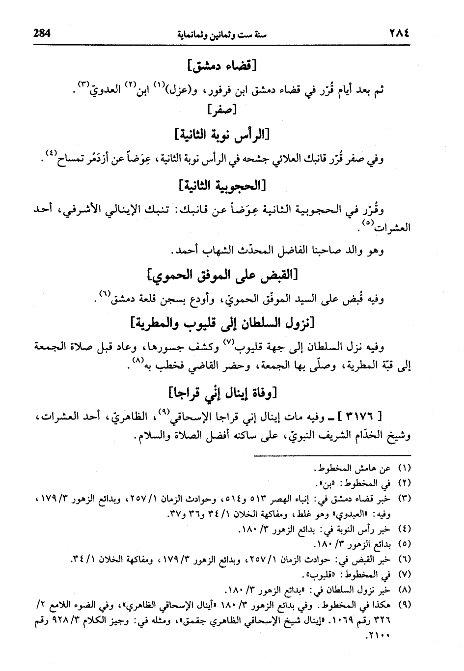(¬3) خبر قضاء دمشق في: إنباء الهصر 513 و 514، وحوادث الزمان 1/ 257، وبدائع الزهور 3/ 179، وفيه: «العبدوي» وهو غلط، ومفاكهة الخلان 1/ 34 و 36 و 37.