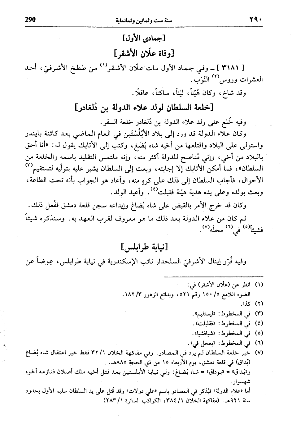 (¬7) خبر خلعة السلطان لم يرد في المصادر. وفي مفاكهة الخلان 1/ 32 فقط خبر اعتقال شاه بضاغ (بداق) في قلعة دمشق، يوم الأربعاء 15 من ذي الحجة 885 هـ. و «بداق» - «بوداق» - شاه بضاغ: ولي نيابة الأبلستين بعد قتل أخيه ملك أصلان فنازعه أخوه شهسوار. أما «علاء الدولة» فيذكر في المصادر باسم «علي دولات» وقد قتل على يد السلطان سليم الأول بحدود سنة 921 هـ. (مفاكهة الخلان 1/ 384، الكواكب السائرة 1/ 283)