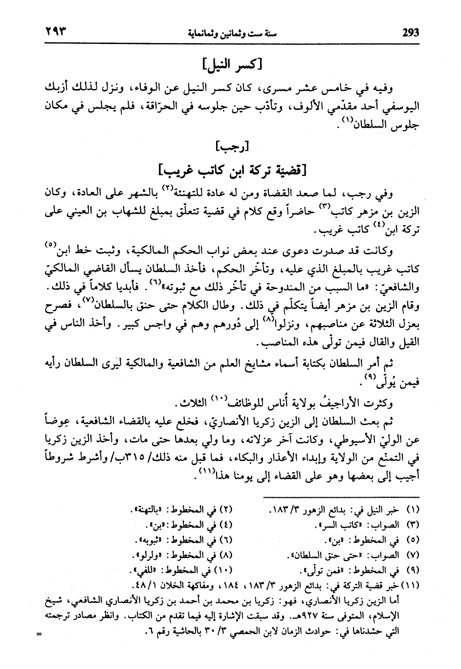 (¬11) خبر قضية التركة في: بدائع الزهور 3/ 183، 184، ومفاكهة الخلان 1/ 48. أما الزين زكريا الأنصاري، فهو: زكريا بن محمد بن أحمد بن زكريا الأنصاري الشافعي، شيخ الإسلام، المتوفى سنة 927 هـ. وقد سبقت الإشارة إليه فيما تقدم من الكتاب. وانظر مصادر ترجمته التي حشدناها في: حوادث الزمان لابن الحمصي 3/ 30 بالحاشية رقم 6.